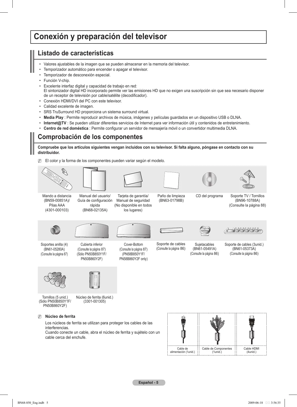 - Anynet+ (HDMI-CEC) Información importante sobre la garantía relativa al formato de visualización del televisor Las pantallas PDP con formato de pantalla panorámica (16:9, la relación de aspecto ancho:alto de la pantalla) están diseñadas principalmente para visualizar vídeos de movimiento de formato panorámico. En estas pantallas debe ver las imágenes en el formato 16:9 de pantalla panorámicao ampliadas para llenar la pantalla si el modelo tiene esta opción, y en movimiento constante. La visualización de imágenesy gráficos estáticos en la pantalla, como las barras oscuras laterales en programación y vídeos de televisión en formato estándar no ampliados, debe limitarse a no más del 5% del tiempo total de visualización del televisor por semana. Además, la visualización de otras imágenes estáticas y texto, como los informes de bolsa, pantallas de videojuegos, logotipos de emisoras, sitios Web o gráficos y dibujos de ordenador, deberá limitarse en todos los televisores como ya se ha descrito. La visualización de imágenes estáticas que supere los límites de las instrucciones anteriores puede producir un envejecimiento desigual de las pantallas PDP, lo que provocará una reproducción superpuesta sutil pero permanente de la imagen. Para evitarlo, varíe la programación y las imágenes y, sobre todo, visualice imágenes en movimiento a toda pantalla, no gráficos estáticos ni barras oscuras. En modelos de PDP que ofrezcan opciones para el tamaño de la imagen, utilice estos controles para ver los distintos formatos como imagen a toda pantalla. Tenga cuidado en la selección y duración de los formatos de televisión utilizados para la visualización. La garantía limitada de Samsung no cubre el envejecimiento desigual de la PDP como resultado de la selección y uso de formatos, así como otras imágenes retenidas. © 2009 Samsung Electronics Co., Ltd. Reservados todos los derechos. Español - 2 BN68-850_Eng.indb 2 2009-06-18 3:56:31 Instrucciones para el usuario Retención de imágenes en la pantalla No deje imágenes fijas visibles (como las de un videojuego) en el panel de la pantalla de plasma durante mucho tiempo, ya que se podría producir la retención de la imagen en la misma. Este fenómeno de retención de imágenes también se denomina “quemadura de pantalla”. Para evitar dicha retención de la imagen, consulte la página 27 de este manual para reducir el grado de brillo y contraste de la pantalla al mostrar una imagen fija. Altitud La PDP sólo puede funcionar normalmente hasta altitudes de 2.000 metros. Calor en la parte superior del TV de plasma La parte superior del aparato puede calentarse tras un uso prolongado ya que el calor se disipa desde el panel a través de los orificios de ventilación de la parte superior. Esto es normal y no indica ningún defecto ni fallo de funcionamiento del aparato. No obstante, debe evitarse que los niños toquen la parte superior del aparato. El aparato emite una especie de crujido. El ruido similar a un crujido puede producirse cuando el aparato se contrae o se expande debido a un cambio ambiental de temperatura o humedad. Este hecho es normal y no se trata de ningún defecto en la unidad. Defecto de celda La PDP utiliza un panel compuesto de 2,360,000 (nivel HD) a 6,221,000(nivel FHD) a píxeles que requieren una sofisticada tecnología para su producción. No obstante, puede que existan unos cuantos píxeles brillantes u oscuros en la pantalla. Estos píxeles no influirán en el rendimiento del aparato. Evite que el TV funcione a temperaturas por debajo de 41 °F (5 °C) La imagen fija visualizada durante demasiado tiempo puede causar daños permanentes en el panel de la PDP. Ver el TV de plasma en formato 4:3 durante un tiempo prolongado puede dejar rastros de bordes en la izquierda, derecha o centro de la pantalla causados por la diferencia de emisión de luz en la pantalla. La reproducción de un DVD o el uso de una consola de videojuegos pueden provocar un efecto similar en la pantalla. Los daños provocados por los efectos mencionados no quedan cubiertos por la garantía. Imágenes fantasma en la pantalla. Ver imágenes fijas de videojuegos y PC durante un periodo prolongado puede producir restos de imágenes parciales. Para evitar este efecto, reduzca el ‘brillo’ y el ‘contraste’ al mostrar imágenes fijas durante un tiempo prolongado. Garantía La garantía no cubre ningún daño causado por la retención de imágenes. La garantía no cubre el desgaste de la pantalla. Español - 3 BN68-850_Eng.indb 3 2009-06-18 3:56:31 Español Índice Conexión y preparación del televisor ■■ Listado de características p. 5
