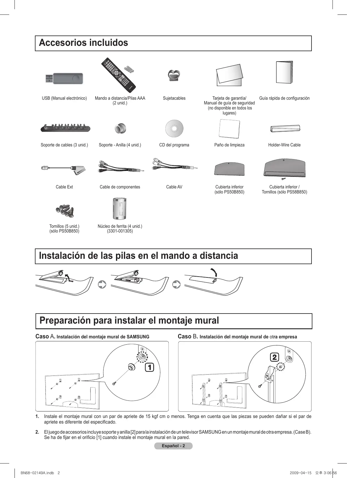 Instalación de las pilas en el mando a distancia Preparación para instalar el montaje mural Caso A. Instalación del montaje mural de SAMSUNG Caso B. Instalación del montaje mural de otra empresa