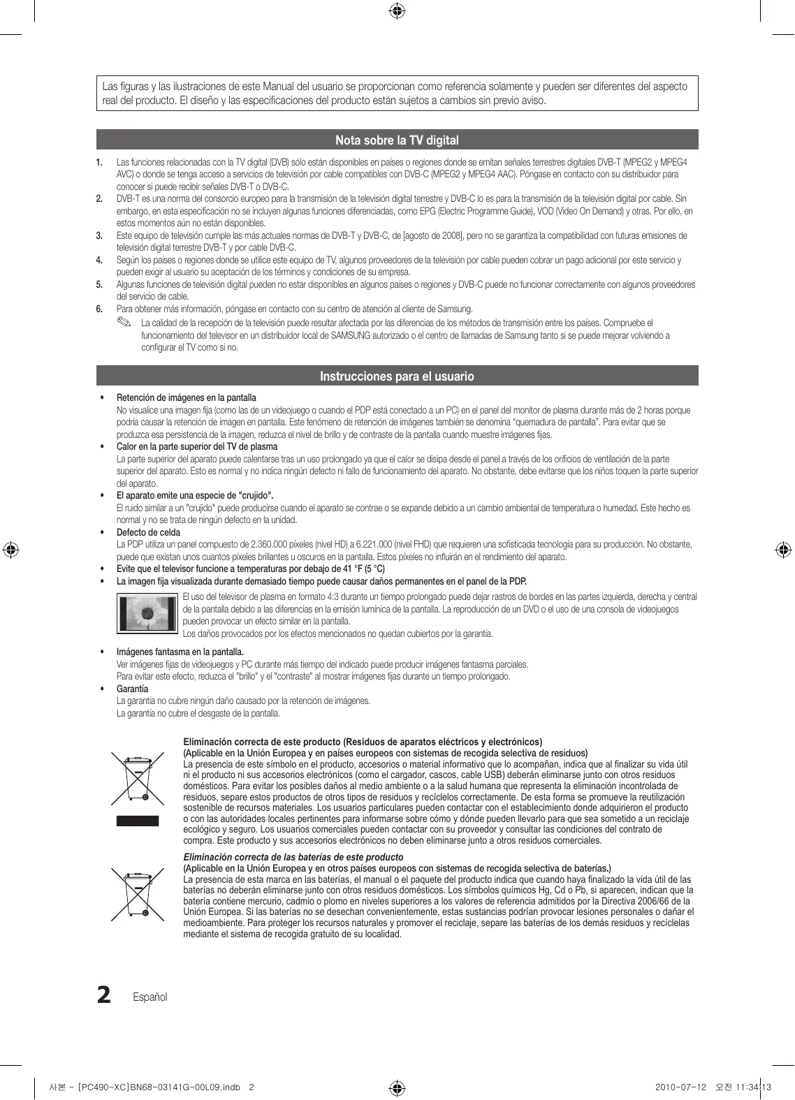 Imágenes fantasma en la pantalla. Ver imágenes fijas de videojuegos y PC durante más tiempo del indicado puede producir imágenes fantasma parciales. Para evitar este efecto, reduzca el "brillo" y el "contraste" al mostrar imágenes fijas durante un tiempo prolongado. Garantía La garantía no cubre ningún daño causado por la retención de imágenes. La garantía no cubre el desgaste de la pantalla. Eliminación correcta de este producto (Residuos de aparatos eléctricos y electrónicos) (Aplicable en la Unión Europea y en países europeos con sistemas de recogida selectiva de residuos) La presencia de este símbolo en el producto, accesorios o material informativo que lo acompañan, indica que al finalizar su vida útil ni el producto ni sus accesorios electrónicos (como el cargador, cascos, cable USB) deberán eliminarse junto con otros residuos domésticos. Para evitar los posibles daños al medio ambiente o a la salud humana que representa la eliminación incontrolada de residuos, separe estos productos de otros tipos de residuos y recíclelos correctamente. De esta forma se promueve la reutilización sostenible de recursos materiales. Los usuarios particulares pueden contactar con el establecimiento donde adquirieron el producto o con las autoridades locales pertinentes para informarse sobre cómo y dónde pueden llevarlo para que sea sometido a un reciclaje ecológico y seguro. Los usuarios comerciales pueden contactar con su proveedor y consultar las condiciones del contrato de compra. Este producto y sus accesorios electrónicos no deben eliminarse junto a otros residuos comerciales. Eliminación correcta de las baterías de este producto (Aplicable en la Unión Europea y en otros países europeos con sistemas de recogida selectiva de baterías.) La presencia de esta marca en las baterías, el manual o el paquete del producto indica que cuando haya finalizado la vida útil de las baterías no deberán eliminarse junto con otros residuos domésticos. Los símbolos químicos Hg, Cd o Pb, si aparecen, indican que la batería contiene mercurio, cadmio o plomo en niveles superiores a los valores de referencia admitidos por la Directiva 2006/66 de la Unión Europea. Si las baterías no se desechan convenientemente, estas sustancias podrían provocar lesiones personales o dañar el medioambiente. Para proteger los recursos naturales y promover el reciclaje, separe las baterías de los demás residuos y recíclelas mediante el sistema de recogida gratuito de su localidad.