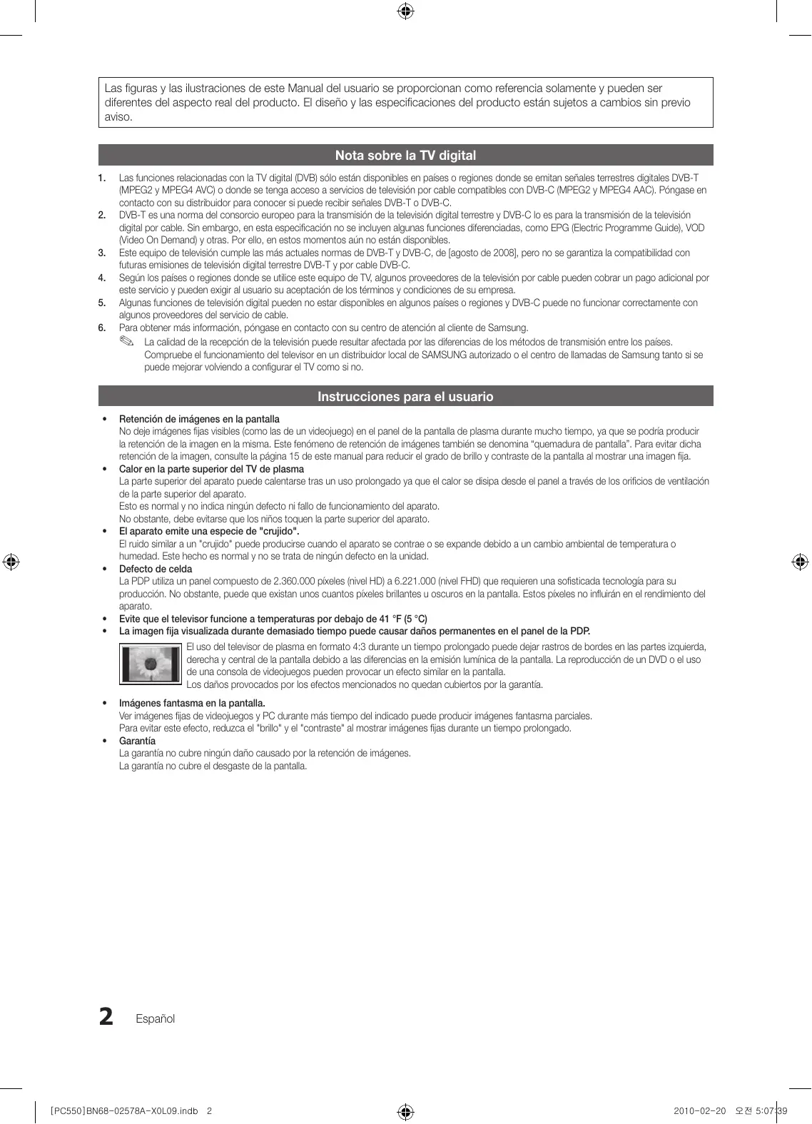 Retención de imágenes en la pantalla No deje imágenes fijas visibles (como las de un videojuego) en el panel de la pantalla de plasma durante mucho tiempo, ya que se podría producir la retención de la imagen en la misma. Este fenómeno de retención de imágenes también se denomina “quemadura de pantalla”. Para evitar dicha retención de la imagen, consulte la página 15 de este manual para reducir el grado de brillo y contraste de la pantalla al mostrar una imagen fija. Calor en la parte superior del TV de plasma La parte superior del aparato puede calentarse tras un uso prolongado ya que el calor se disipa desde el panel a través de los orificios de ventilación de la parte superior del aparato. Esto es normal y no indica ningún defecto ni fallo de funcionamiento del aparato. No obstante, debe evitarse que los niños toquen la parte superior del aparato. El aparato emite una especie de "crujido". El ruido similar a un "crujido" puede producirse cuando el aparato se contrae o se expande debido a un cambio ambiental de temperatura o humedad. Este hecho es normal y no se trata de ningún defecto en la unidad. Defecto de celda La PDP utiliza un panel compuesto de 2.360.000 píxeles (nivel HD) a 6.221.000 (nivel FHD) que requieren una sofisticada tecnología para su producción. No obstante, puede que existan unos cuantos píxeles brillantes u oscuros en la pantalla. Estos píxeles no influirán en el rendimiento del aparato. Evite que el televisor funcione a temperaturas por debajo de 41 °F (5 °C) La imagen fija visualizada durante demasiado tiempo puede causar daños permanentes en el panel de la PDP. El uso del televisor de plasma en formato 4:3 durante un tiempo prolongado puede dejar rastros de bordes en las partes izquierda, derecha y central de la pantalla debido a las diferencias en la emisión lumínica de la pantalla. La reproducción de un DVD o el uso de una consola de videojuegos pueden provocar un efecto similar en la pantalla. Los daños provocados por los efectos mencionados no quedan cubiertos por la garantía.