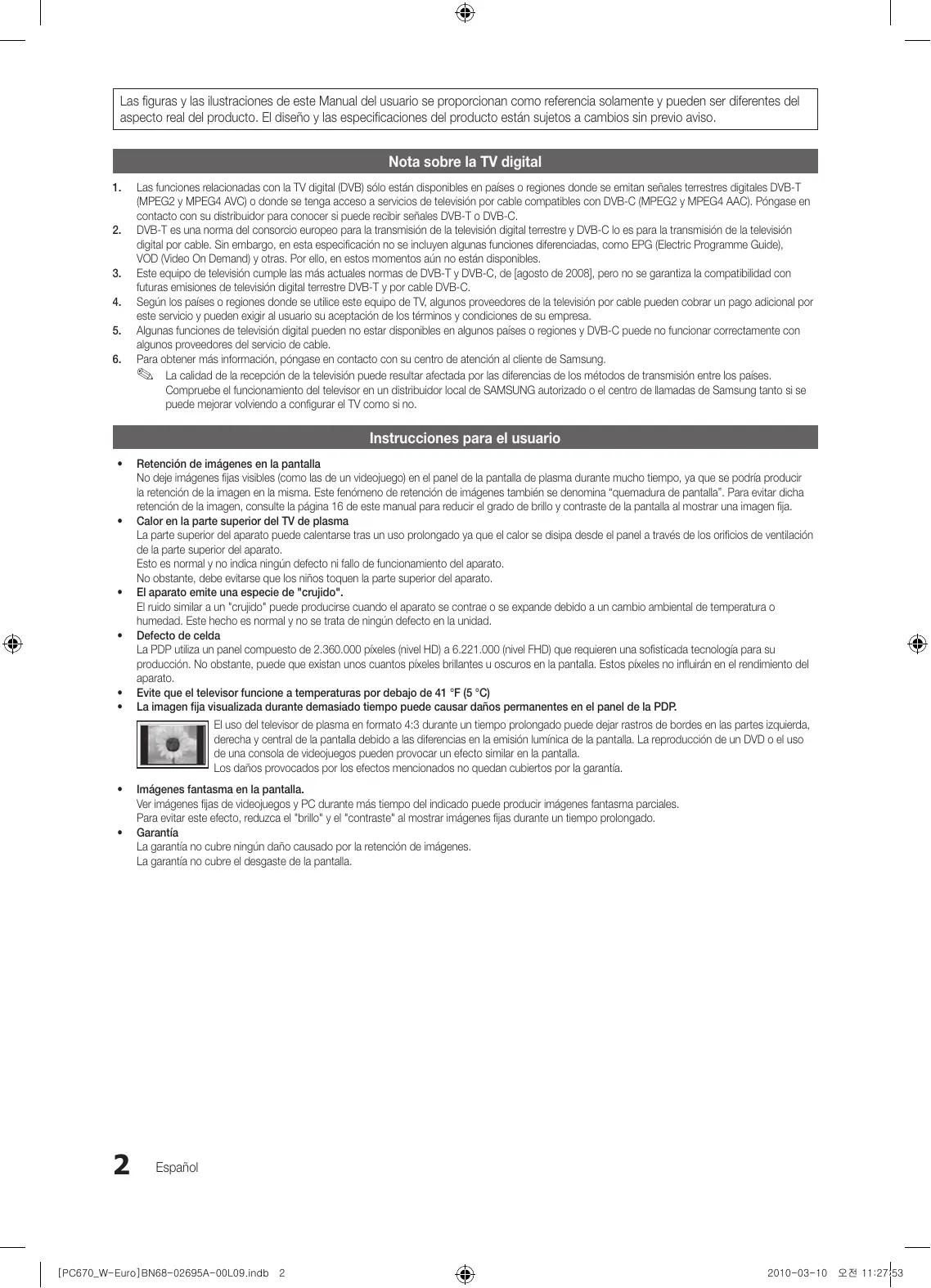 Retención de imágenes en la pantalla No deje imágenes fijas visibles (como las de un videojuego) en el panel de la pantalla de plasma durante mucho tiempo, ya que se podría producir la retención de la imagen en la misma. Este fenómeno de retención de imágenes también se denomina “quemadura de pantalla”. Para evitar dicha retención de la imagen, consulte la página 16 de este manual para reducir el grado de brillo y contraste de la pantalla al mostrar una imagen fija. Calor en la parte superior del TV de plasma La parte superior del aparato puede calentarse tras un uso prolongado ya que el calor se disipa desde el panel a través de los orificios de ventilación de la parte superior del aparato. Esto es normal y no indica ningún defecto ni fallo de funcionamiento del aparato. No obstante, debe evitarse que los niños toquen la parte superior del aparato. El aparato emite una especie de "crujido". El ruido similar a un "crujido" puede producirse cuando el aparato se contrae o se expande debido a un cambio ambiental de temperatura o humedad. Este hecho es normal y no se trata de ningún defecto en la unidad. Defecto de celda La PDP utiliza un panel compuesto de 2.360.000 píxeles (nivel HD) a 6.221.000 (nivel FHD) que requieren una sofisticada tecnología para su producción. No obstante, puede que existan unos cuantos píxeles brillantes u oscuros en la pantalla. Estos píxeles no influirán en el rendimiento del aparato. Evite que el televisor funcione a temperaturas por debajo de 41 °F (5 °C) La imagen fija visualizada durante demasiado tiempo puede causar daños permanentes en el panel de la PDP. El uso del televisor de plasma en formato 4:3 durante un tiempo prolongado puede dejar rastros de bordes en las partes izquierda, derecha y central de la pantalla debido a las diferencias en la emisión lumínica de la pantalla. La reproducción de un DVD o el uso de una consola de videojuegos pueden provocar un efecto similar en la pantalla. Los daños provocados por los efectos mencionados no quedan cubiertos por la garantía.