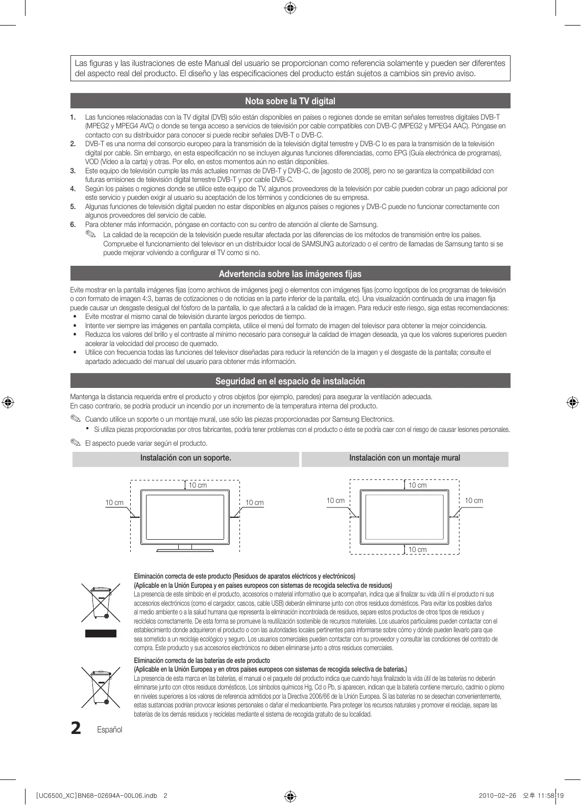 - Utilice con frecuencia todas las funciones del televisor diseñadas para reducir la retención de la imagen y el desgaste de la pantalla; consulte el apartado adecuado del manual del usuario para obtener más información. Seguridad en el espacio de instalación Mantenga la distancia requerida entre el producto y otros objetos (por ejemplo, paredes) para asegurar la ventilación adecuada. En caso contrario, se podría producir un incendio por un incremento de la temperatura interna del producto. ✎✎ Cuando utilice un soporte o un montaje mural, use sólo las piezas proporcionadas por Samsung Electronics. xx Si utiliza piezas proporcionadas por otros fabricantes, podría tener problemas con el producto o éste se podría caer con el riesgo de causar lesiones personales. ✎✎ El aspecto puede variar según el producto. Instalación con un soporte. Instalación con un montaje mural 10 cm 10 cm 10 cm 10 cm 10 cm 10 cm 10 cm Eliminación correcta de este producto (Residuos de aparatos eléctricos y electrónicos) (Aplicable en la Unión Europea y en países europeos con sistemas de recogida selectiva de residuos) La presencia de este símbolo en el producto, accesorios o material informativo que lo acompañan, indica que al finalizar su vida útil ni el producto ni sus accesorios electrónicos (como el cargador, cascos, cable USB) deberán eliminarse junto con otros residuos domésticos. Para evitar los posibles daños al medio ambiente o a la salud humana que representa la eliminación incontrolada de residuos, separe estos productos de otros tipos de residuos y recíclelos correctamente. De esta forma se promueve la reutilización sostenible de recursos materiales. Los usuarios particulares pueden contactar con el establecimiento donde adquirieron el producto o con las autoridades locales pertinentes para informarse sobre cómo y dónde pueden llevarlo para que sea sometido a un reciclaje ecológico y seguro. Los usuarios comerciales pueden contactar con su proveedor y consultar las condiciones del contrato de compra. Este producto y sus accesorios electrónicos no deben eliminarse junto a otros residuos comerciales.
