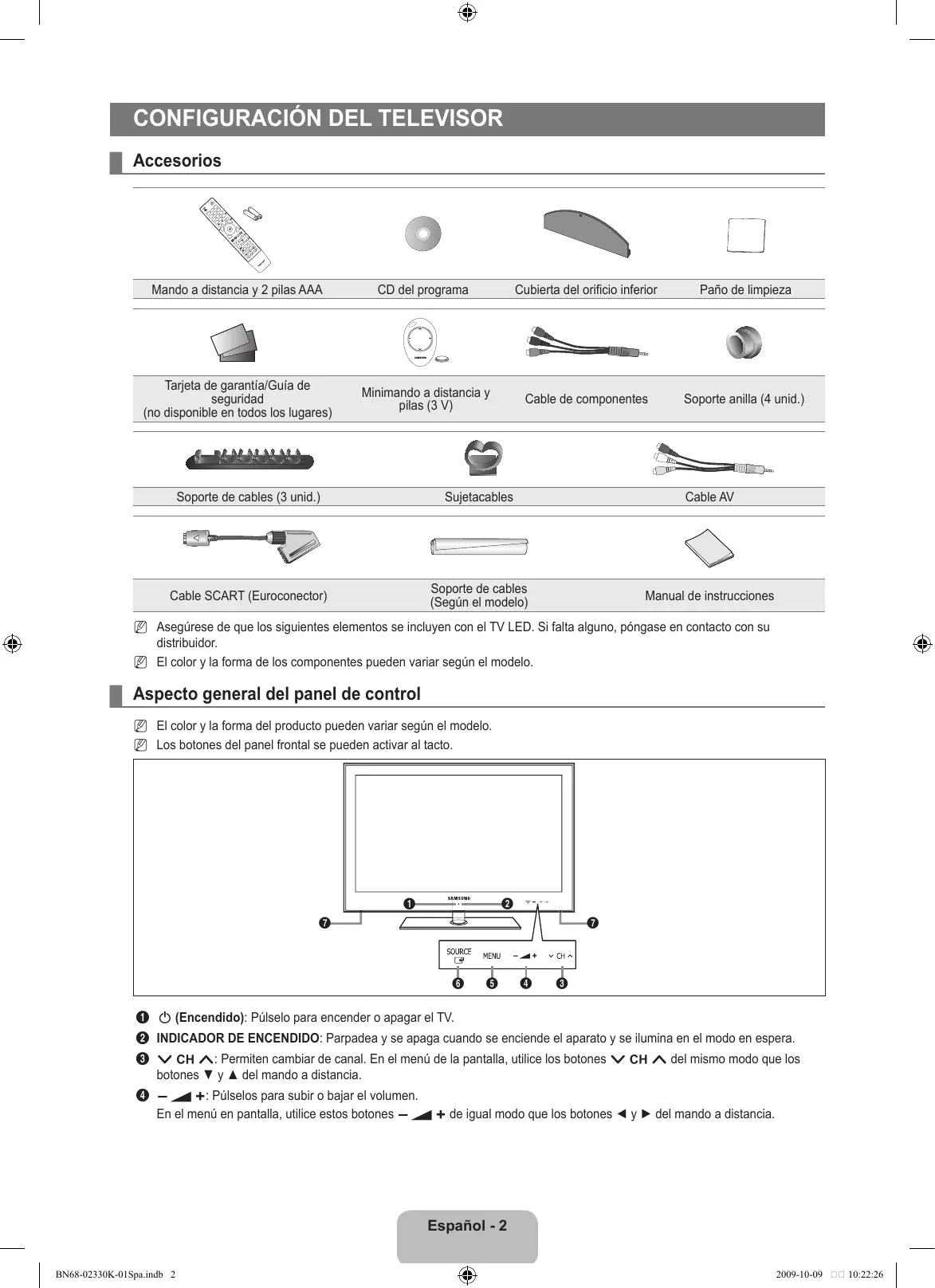 Botón TOOLS Pulsar Configuración del televisor ¦ Accesorios Mando a distancia y 2 pilas AAA CD del programa Cubierta del orificio inferior Paño de limpieza Tarjeta de garantía/Guía de seguridad (no disponible en todos los lugares) Minimando a distancia y pilas (3 V) Cable de componentes Soporte anilla (4 unid.) Soporte de cables (3 unid.) Sujetacables Cable AV Soporte de cables (Según el modelo) Manual de instrucciones N Asegúrese de que los siguientes elementos se incluyen con el TV LED. Si falta alguno, póngase en contacto con su distribuidor. N El color y la forma de los componentes pueden variar según el modelo. ¦ Aspecto general del panel de control N El color y la forma del producto pueden variar según el modelo. N Los botones del panel frontal se pueden activar al tacto.