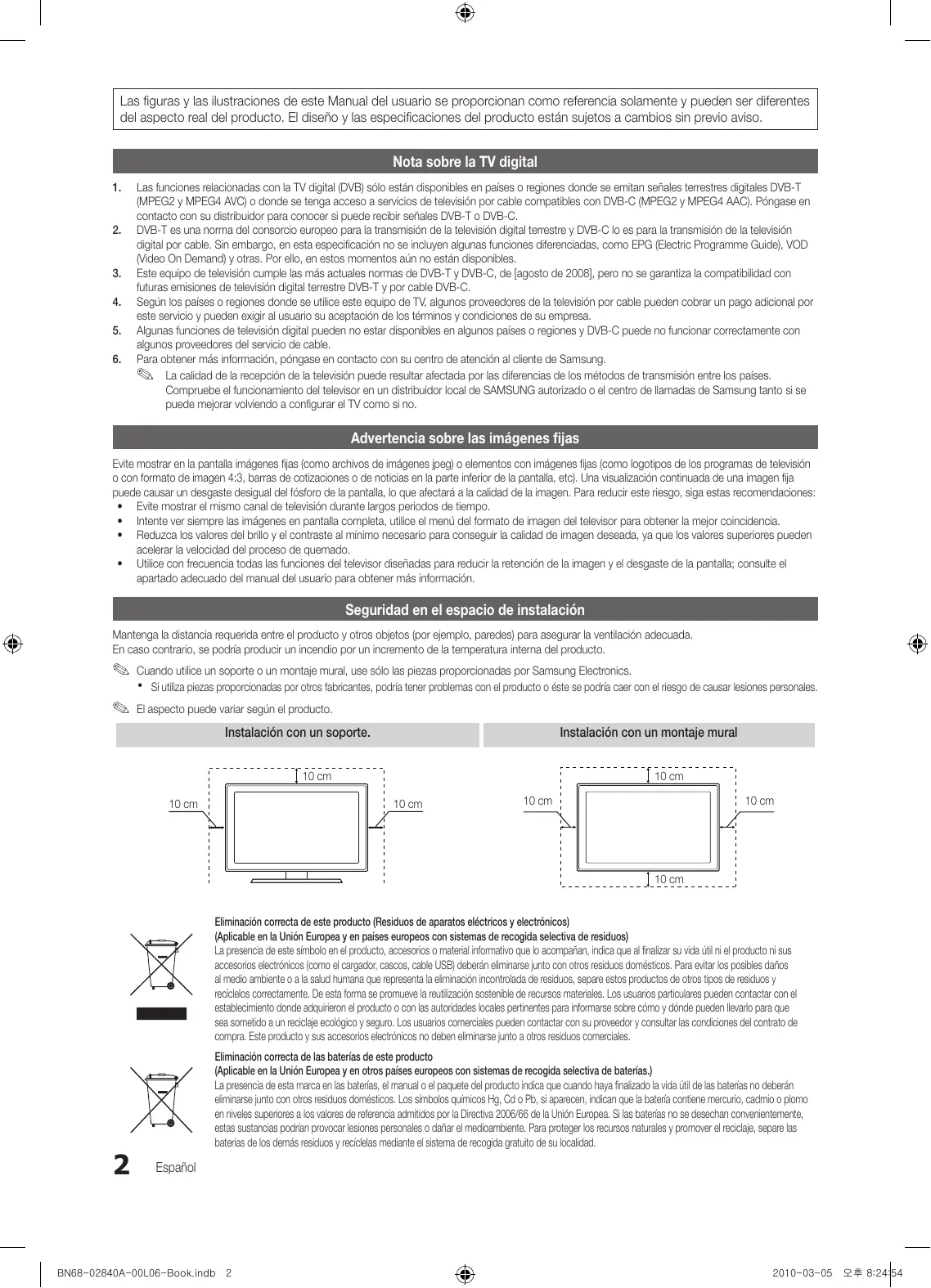 - Utilice con frecuencia todas las funciones del televisor diseñadas para reducir la retención de la imagen y el desgaste de la pantalla; consulte el apartado adecuado del manual del usuario para obtener más información. Seguridad en el espacio de instalación Mantenga la distancia requerida entre el producto y otros objetos (por ejemplo, paredes) para asegurar la ventilación adecuada. En caso contrario, se podría producir un incendio por un incremento de la temperatura interna del producto. ✎✎ Cuando utilice un soporte o un montaje mural, use sólo las piezas proporcionadas por Samsung Electronics. xx Si utiliza piezas proporcionadas por otros fabricantes, podría tener problemas con el producto o éste se podría caer con el riesgo de causar lesiones personales. ✎✎ El aspecto puede variar según el producto. Instalación con un soporte. Instalación con un montaje mural 10 cm 10 cm 10 cm 10 cm 10 cm 10 cm 10 cm Eliminación correcta de este producto (Residuos de aparatos eléctricos y electrónicos) (Aplicable en la Unión Europea y en países europeos con sistemas de recogida selectiva de residuos) La presencia de este símbolo en el producto, accesorios o material informativo que lo acompañan, indica que al finalizar su vida útil ni el producto ni sus accesorios electrónicos (como el cargador, cascos, cable USB) deberán eliminarse junto con otros residuos domésticos. Para evitar los posibles daños al medio ambiente o a la salud humana que representa la eliminación incontrolada de residuos, separe estos productos de otros tipos de residuos y recíclelos correctamente. De esta forma se promueve la reutilización sostenible de recursos materiales. Los usuarios particulares pueden contactar con el establecimiento donde adquirieron el producto o con las autoridades locales pertinentes para informarse sobre cómo y dónde pueden llevarlo para que sea sometido a un reciclaje ecológico y seguro. Los usuarios comerciales pueden contactar con su proveedor y consultar las condiciones del contrato de compra. Este producto y sus accesorios electrónicos no deben eliminarse junto a otros residuos comerciales.