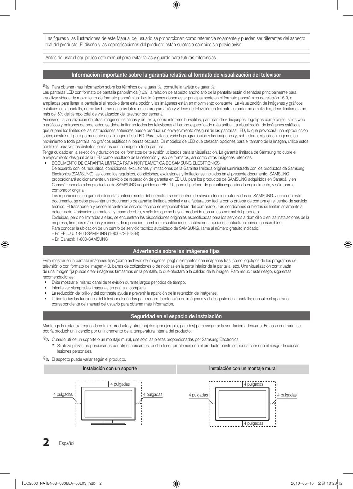 - DOCUMENTO DE GARANTÍA LIMITADA PARA NORTEAMÉRICA DE SAMSUNG ELECTRONICS De acuerdo con los requisitos, condiciones, exclusiones y limitaciones de la Garantía limitada original suministrada con los productos de Samsung Electronics (SAMSUNG), así como los requisitos, condiciones, exclusiones y limitaciones incluidos en el presente documento, SAMSUNG proporcionará adicionalmente un servicio de reparación de garantía en EE.UU. para los productos de SAMSUNG adquiridos en Canadá, y en Canadá respecto a los productos de SAMSUNG adquiridos en EE.UU., para el período de garantía especificado originalmente, y sólo para el comprador original. Las reparaciones en garantía descritas anteriormente deben realizarse en centros de servicio técnico autorizados de SAMSUNG. Junto con este documento, se debe presentar un documento de garantía limitada original y una factura con fecha como prueba de compra en el centro de servicio técnico. El transporte a y desde el centro de servicio técnico es responsabilidad del comprador. Las condiciones cubiertas se limitan solamente a defectos de fabricación en material y mano de obra, y sólo los que se hayan producido con un uso normal del producto. Excluidas, pero no limitadas a ellas, se encuentran las disposiciones originales especificadas para los servicios a domicilio o en las instalaciones de la empresa, tiempos máximos y mínimos de reparación, cambios o sustituciones, accesorios, opciones, actualizaciones o consumibles. Para conocer la ubicación de un centro de servicio técnico autorizado de SAMSUNG, llame al número gratuito indicado: – En EE. UU: 1-800-SAMSUNG (1-800-726-7864) – En Canadá: 1-800-SAMSUNG Advertencia sobre las imágenes fijas Evite mostrar en la pantalla imágenes fijas (como archivos de imágenes jpeg) o elementos con imágenes fijas (como logotipos de los programas de televisión o con formato de imagen 4:3, barras de cotizaciones o de noticias en la parte inferior de la pantalla, etc). Una visualización continuada de una imagen fija puede crear imágenes fantasmas en la pantalla, lo que afectará a la calidad de la imagen. Para reducir este riesgo, siga estas recomendaciones: