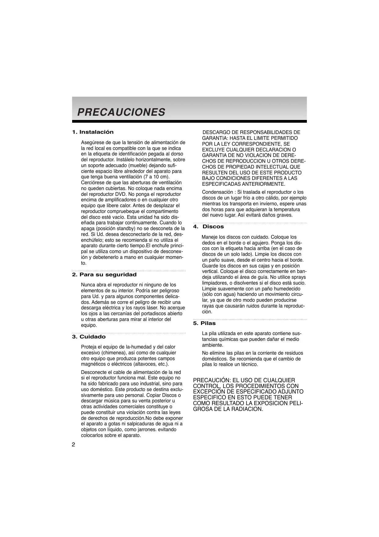 Nunca abra el reproductor ni ninguno de los elementos de su interior. Podría ser peligroso para Ud. y para algunos componentes delicados. Además se corre el peligro de recibir una descarga eléctrica y los rayos láser. No acerque los ojos a las cercanías del portadiscos abierto u otras aberturas para mirar al interior del equipo.