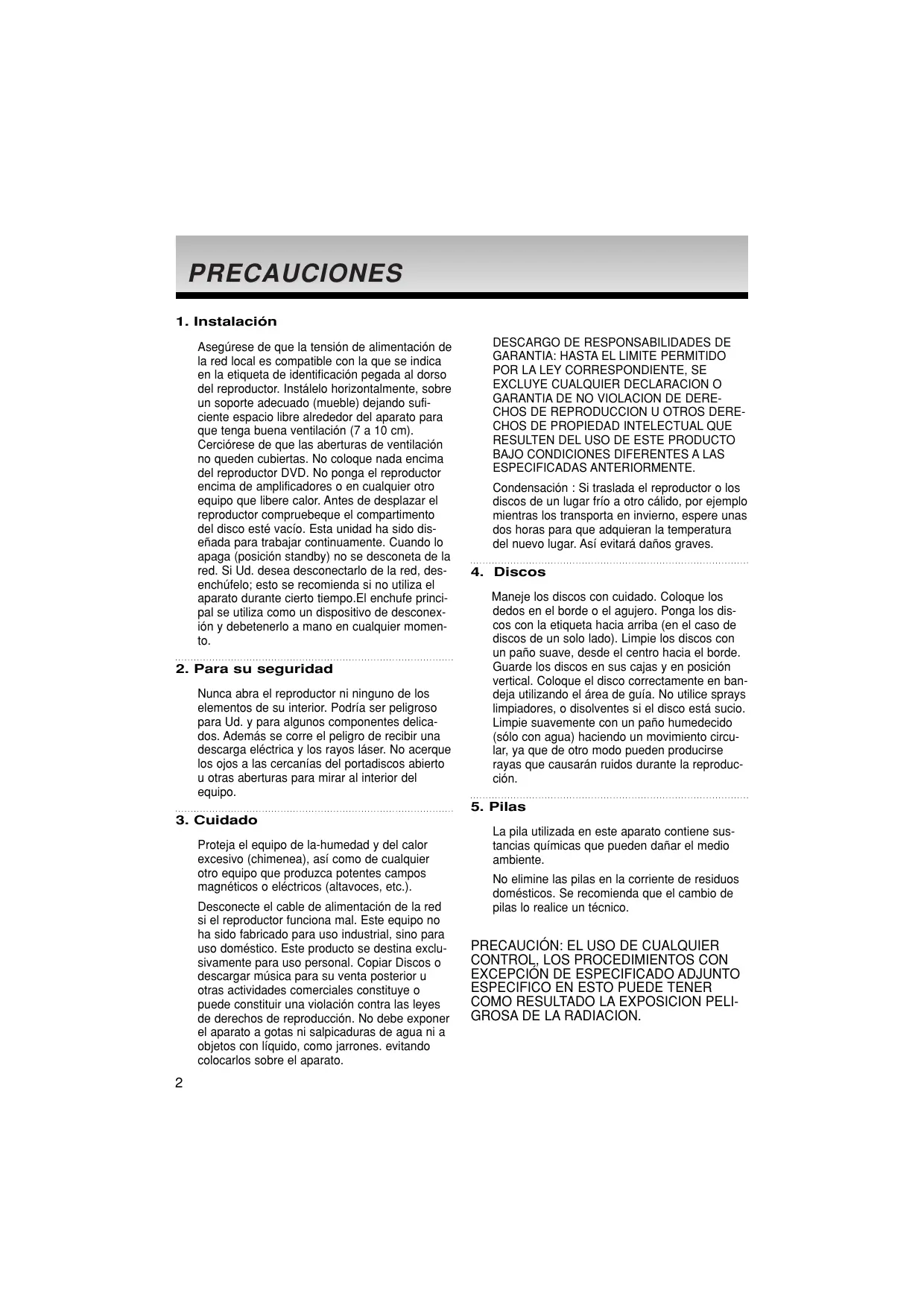 Nunca abra el reproductor ni ninguno de los elementos de su interior. Podría ser peligroso para Ud. y para algunos componentes delicados. Además se corre el peligro de recibir una descarga eléctrica y los rayos láser. No acerque los ojos a las cercanías del portadiscos abierto u otras aberturas para mirar al interior del equipo.