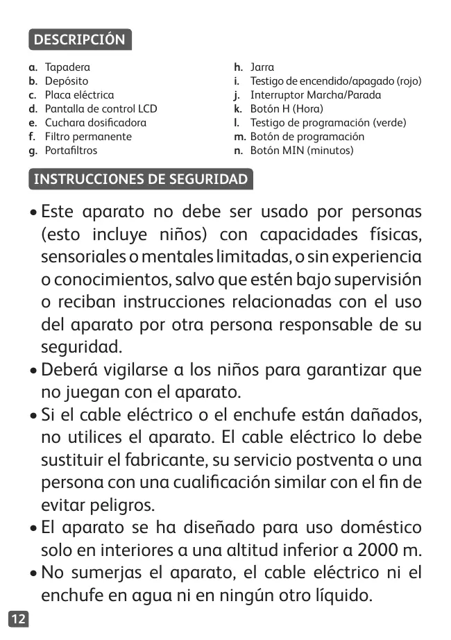 únicamente el asa de la jarra de cristal durante la fase de calentamiento y hasta que se enfríe. • Los niños menores de 8 años podrán utilizar el aparato siempre bajo supervisión, si han recibido instrucciones sobre el uso del aparato