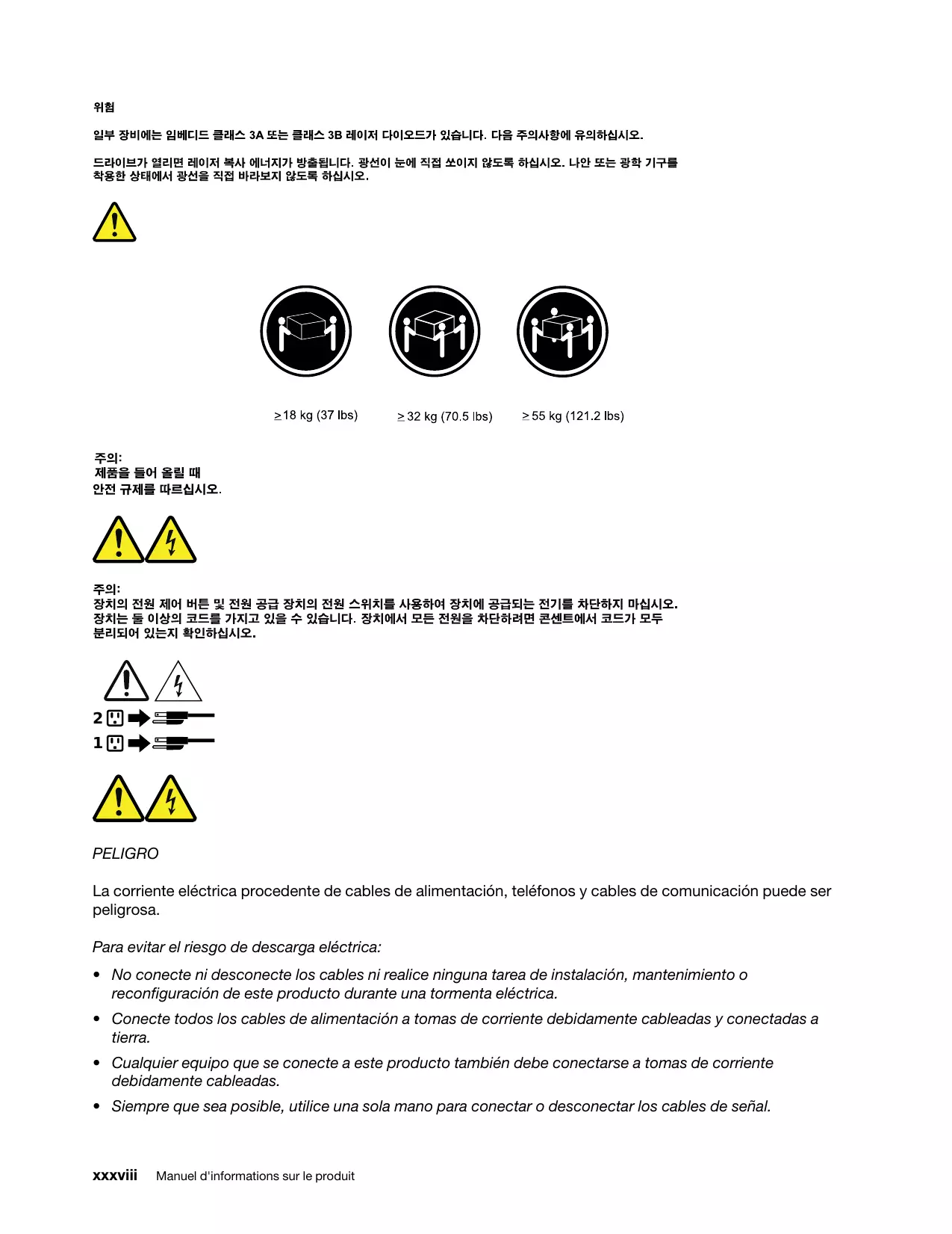 - Siempre que sea posible, utilice una sola mano para conectar o desconectar los cables de señal. xxxviii Manuel d'informations sur le produit