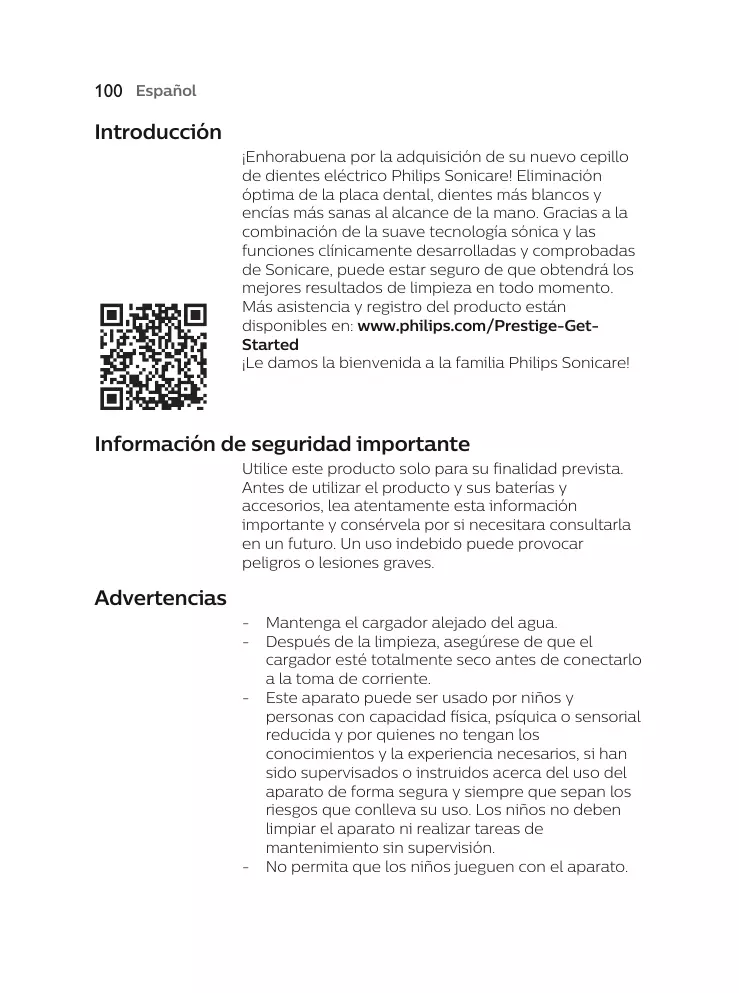 Directiva de equipo radioeléctrico Por la presente, Philips declara que los cepillos dentales eléctricos con interfaz de radiofrecuencia (Bluetooth o BrushSync) cumplen la Directiva 2014/53/UE. - Frecuencia de radio Bluetooth: 2,4 GHz - Potencia máxima de radiofrecuencia de Bluetooth: 3 dBm - Frecuencia de radio NFC: 13,56 MHz - Potencia máxima de radiofrecuencia de NFC: 30,16 dBm El texto completo de la declaración de conformidad de la UE se encuentra disponible en la siguiente dirección de internet: www.philips.com/support. Uso indicado Los cepillos de dientes Sonicare Prestige están diseñados para eliminar la placa dental y los restos de alimentos de los dientes con el fin de reducir la caries dental, y de mejorar y mantener la higiene bucal. Los cepillos de dientes eléctricos Prestige están diseñados para uso doméstico. Los niños deben usarlos bajo la supervisión de un adulto. Su Philips Sonicare