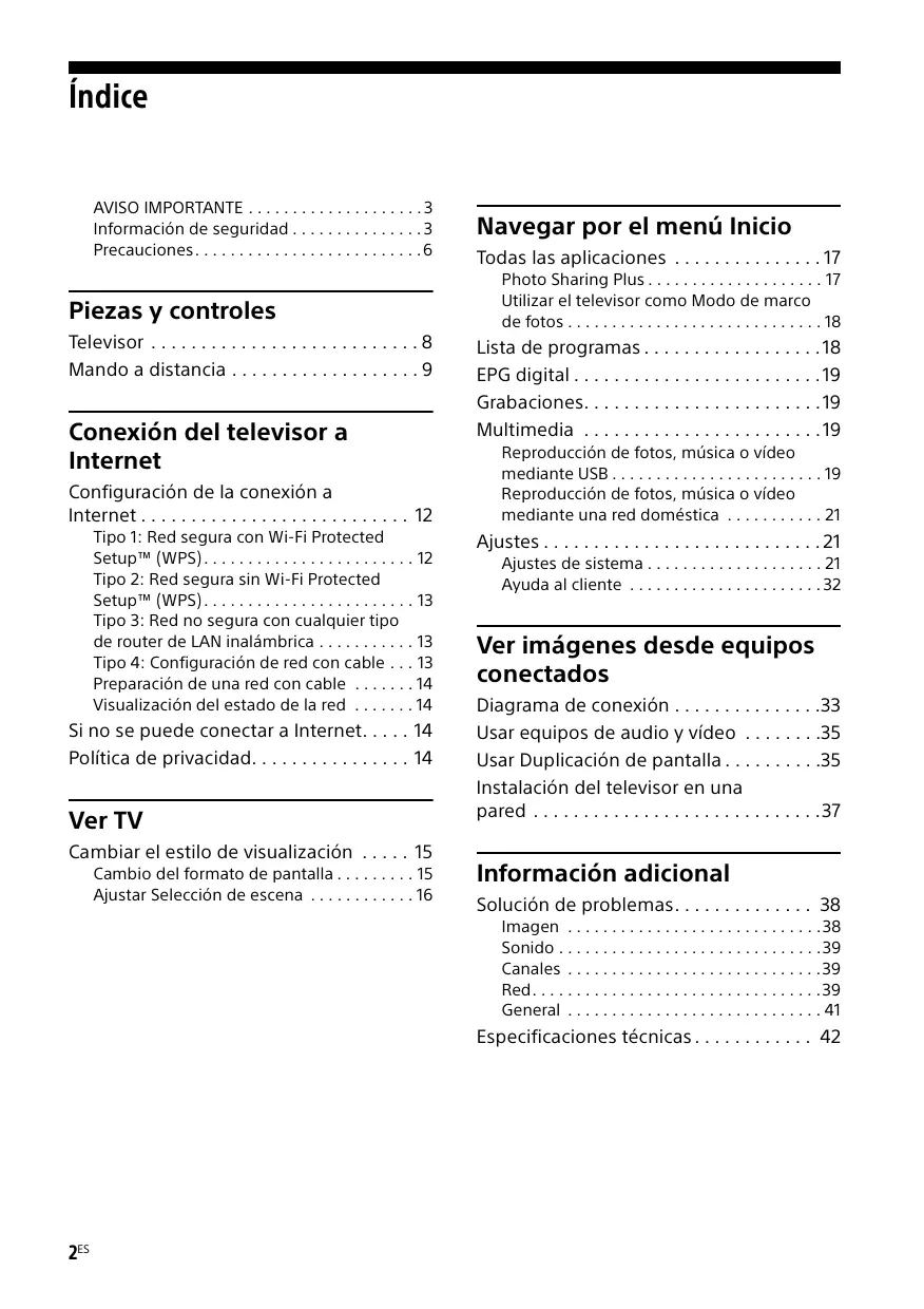 • DiSEqC™ est une marque déposée de EUTELSAT. Ce téléviseur prend en charge DiSEqC 1.0. Ce téléviseur n’est pas destiné à commander des antennes à moteur. 43FR 44FR Índice AVISO IMPORTANTE . . . . . . . . . . . . . . . . . . . . 3 Información de seguridad . . . . . . . . . . . . . . . 3 Precauciones. . . . . . . . . . . . . . . . . . . . . . . . . . 6 Piezas y controles Televisor . . . . . . . . . . . . . . . . . . . . . . . . . . . 8 Mando a distancia . . . . . . . . . . . . . . . . . . . 9 Conexión del televisor a Internet Configuración de la conexión a Internet . . . . . . . . . . . . . . . . . . . . . . . . . . . 12 Tipo 1: Red segura con Wi-Fi Protected Setup™ (WPS) . . . . . . . . . . . . . . . . . . . . . . . . 12 Tipo 2: Red segura sin Wi-Fi Protected Setup™ (WPS) . . . . . . . . . . . . . . . . . . . . . . . . 13 Tipo 3: Red no segura con cualquier tipo de router de LAN inalámbrica . . . . . . . . . . . 13 Tipo 4: Configuración de red con cable . . . 13 Preparación de una red con cable . . . . . . . 14 Visualización del estado de la red . . . . . . . 14 Si no se puede conectar a Internet. . . . . 14 Política de privacidad. . . . . . . . . . . . . . . . 14 Ver TV Navegar por el menú Inicio Todas las aplicaciones . . . . . . . . . . . . . . . 17 Photo Sharing Plus . . . . . . . . . . . . . . . . . . . . 17 Utilizar el televisor como Modo de marco de fotos . . . . . . . . . . . . . . . . . . . . . . . . . . . . . 18 Lista de programas . . . . . . . . . . . . . . . . . . 18 EPG digital . . . . . . . . . . . . . . . . . . . . . . . . . 19 Grabaciones. . . . . . . . . . . . . . . . . . . . . . . . 19 Multimedia . . . . . . . . . . . . . . . . . . . . . . . . 19 Reproducción de fotos, música o vídeo mediante USB . . . . . . . . . . . . . . . . . . . . . . . . 19 Reproducción de fotos, música o vídeo mediante una red doméstica . . . . . . . . . . . 21 Ajustes . . . . . . . . . . . . . . . . . . . . . . . . . . . . 21 Ajustes de sistema . . . . . . . . . . . . . . . . . . . . 21 Ayuda al cliente . . . . . . . . . . . . . . . . . . . . . . 32 Ver imágenes desde equipos conectados Diagrama de conexión . . . . . . . . . . . . . . .33 Usar equipos de audio y vídeo . . . . . . . .35 Usar Duplicación de pantalla . . . . . . . . . .35 Instalación del televisor en una pared . . . . . . . . . . . . . . . . . . . . . . . . . . . . .37 Cambiar el estilo de visualización . . . . . 15 Cambio del formato de pantalla . . . . . . . . . 15 Ajustar Selección de escena . . . . . . . . . . . . 16 Información adicional Solución de problemas. . . . . . . . . . . . . . 38 Imagen . . . . . . . . . . . . . . . . . . . . . . . . . . . . .38 Sonido . . . . . . . . . . . . . . . . . . . . . . . . . . . . . .39 Canales . . . . . . . . . . . . . . . . . . . . . . . . . . . . .39 Red. . . . . . . . . . . . . . . . . . . . . . . . . . . . . . . . .39 General . . . . . . . . . . . . . . . . . . . . . . . . . . . . . 41 Especificaciones técnicas . . . . . . . . . . . . 42 2ES Conexión a Internet y privacidad de datos Al conectarse una red, este producto se conecta a Internet durante la configuración inicial para, en primer lugar, confirmar la conexión a Internet y, después, configurar la pantalla de inicio. Su dirección IP se utiliza en esta y en otras conexiones a Internet. Si no desea que se utilice su dirección IP en absoluto, no configure la función inalámbrica de Internet y no conecte un cable de Internet. Para obtener más detalles sobre las conexiones a Internet, consulte la información de privacidad mostrada en la pantalla de configuración. Introducción Gracias por elegir este producto Sony. Antes de utilizar el televisor, lea este manual atentamente y consérvelo para consultarlo en el futuro. Nota