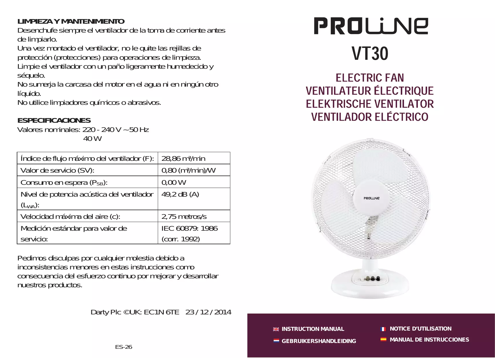 VT30 - Ventilateur électrique PROLINE - Manual de uso y guía de instrucciones gratis
