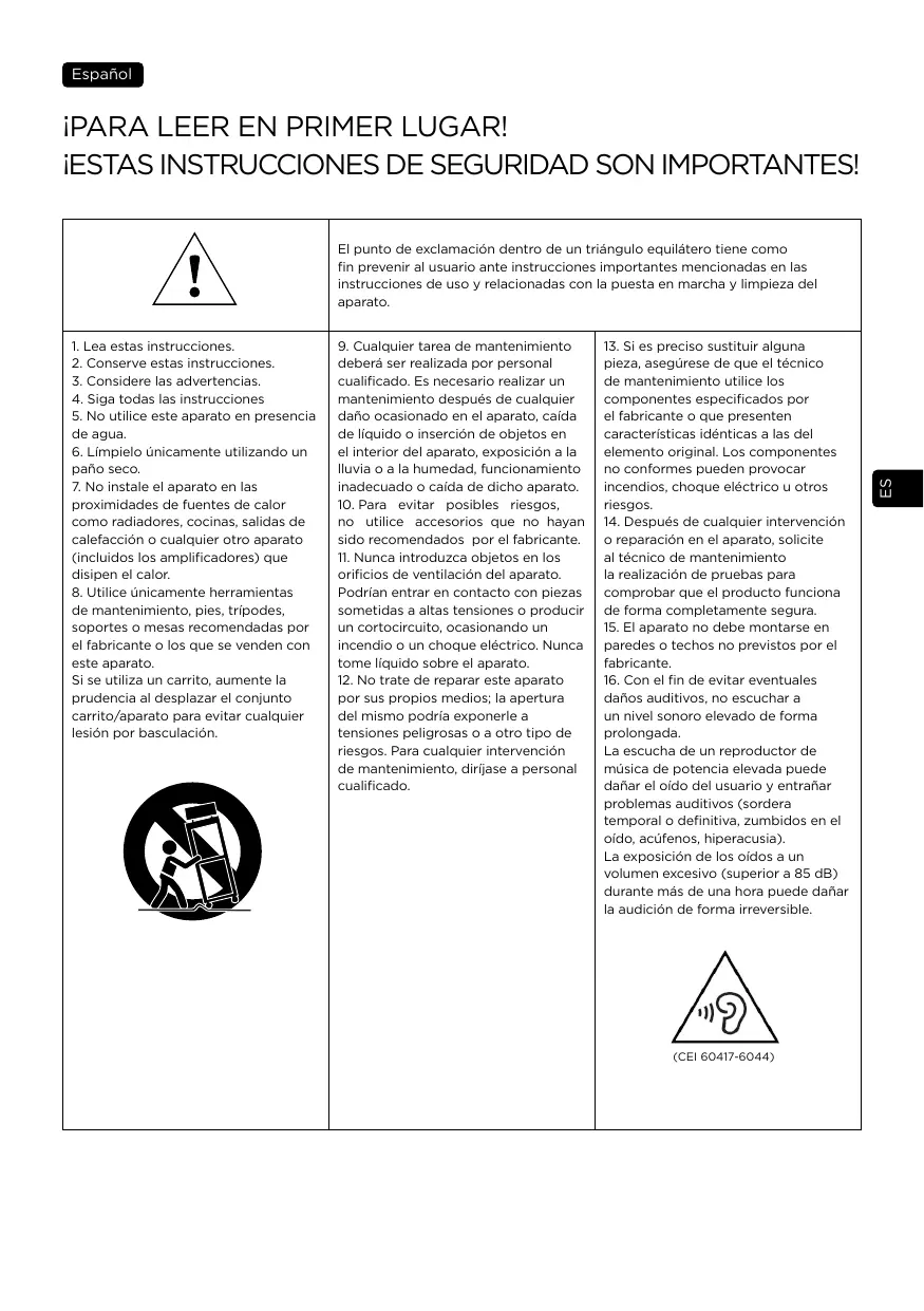 1. Lire ces instructions. 2. Conserver ces instructions. 3. Prendre en considération les mises en garde. 4. Suivre toutes les instructions. 5. Après avoir déballé le produit, veiller à ne pas laisser l’emballage à portée des enfants. Il présente un risque de suffocation. 5. Ne pas utiliser pas cet appareil à proximité de l’eau. 6. Nettoyer uniquement avec un chiffon sec. 7. Ne pas installer l’appareil à proximité d’une source de chaleur telle qu’un radiateur, une cuisinière, une bouche de chauffage ou tout autre appareil ou tout dispositif (y compris les amplificateurs) dissipant de la chaleur. 8. Utiliser uniquement les accessoires recommandés par le fabricant. 9. N’utiliser que les chariots, pieds, trépieds, supports ou tables recommandés par le fabricant ou ceux vendus avec l’appareil. Lorsqu’un chariot est utilisé, redoubler de prudence pendant le déplacement de l’ensemble chariot/appareil afin d’éviter toute blessure par basculement. 10. Toute tâche de maintenance doit être réalisée par un personnel qualifié. Une maintenance est nécessaire à la suite de tout dommage occasionné à l’appareil tel que la détérioration du câble ou de la fiche d’alimentation, le déversement de liquide ou l’insertion d’objets à l’intérieur de l’appareil, l’exposition à la pluie ou à l’humidité, le mauvais fonctionnement ou la chute de l’appareil.