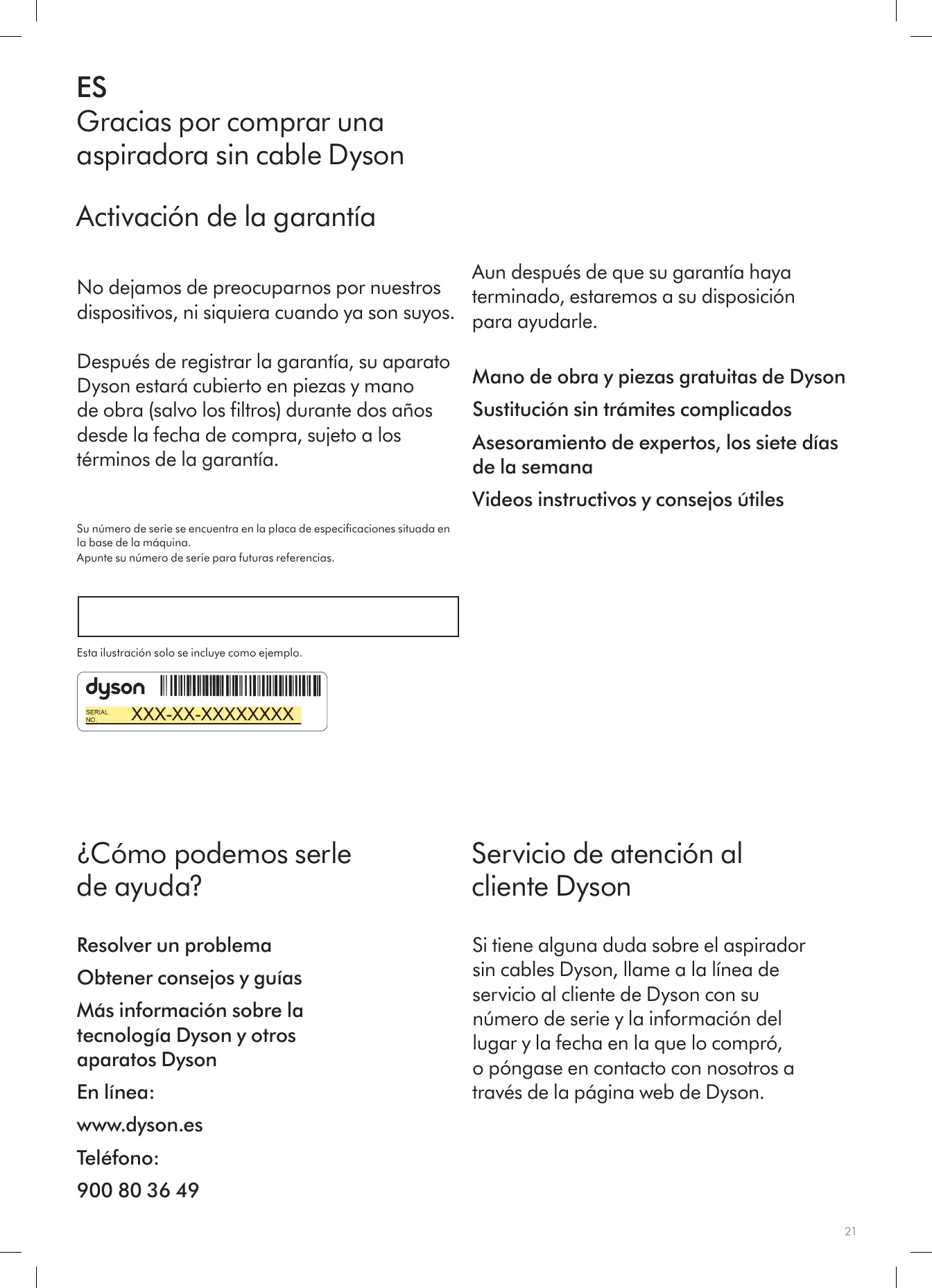 Lavado de la unidad de filtro Lave la unidad de filtro al menos una vez al mes, o siempre que el indicador de mantenimiento del filtro se encienda. Compruebe y lave la unidad de filtro, siguiendo las instrucciones, para mantener su rendimiento. • Extraiga la unidad de filtro girándola en el sentido contrario de las agujas del reloj. Retírela suavemente del dispositivo. Regístrese como propietario de un aparato Dyson La garantía de este producto es de 2 años a partir de la fecha de compra. Registre su garantía en los 30 días posteriores a su fecha de compra. A fin de ayudarnos a garantizar un servicio rápido y eficiente, regístrela inmediatamente después de la compra. Guarde el ticket con la fecha de compra. Dispone de tres formas para ello: • En línea www.dyson.es • Por teléfono en la líne a de servicio al cliente de Dyson en el 900 80 36 49. • Rellene el formulario adjunto y envíenoslo por correo. Ventajas de registrarse en línea o por teléfono: • La garantía entra en vigor el día de la compra (o de la entrega si es posterior). • Debe facilitar el comprobante (la copia original y cualquier comprobante posterior) de entrega/compra antes de que se realice cualquier tipo de servicio en su dispositivo Dyson. Sin este comprobante, cualquier trabajo realizado se cobrará. Por favor, guarde su recibo o nota de entrega. • Une fois que vous vous serez enregistré pour la garantie de 2 ans, votre appareil Dyson sera couvert pour les pièces et la main-d’œuvre (à l’exception des filtres) pendant 2 ans à compter de la date d’achat, conformément aux conditions de garantie.