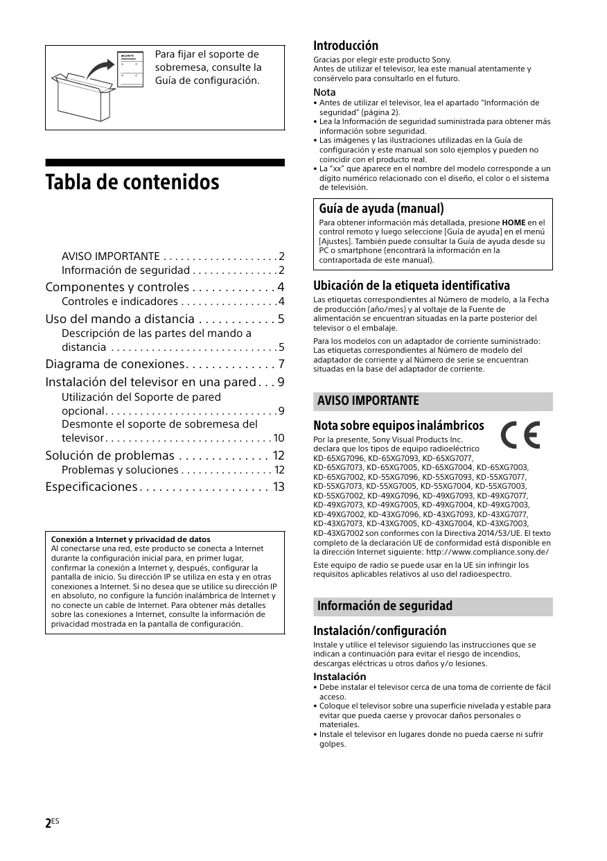 Descarga las instrucciones para tu TELEVISOR en formato PDF gratis! Encuentra tus instrucciones KD435XG7077SAEP - SONY y toma tu dispositivo electrónico nuevamente en la mano. En esta página están publicados todos los documentos necesarios para el uso de su dispositivo. KD435XG7077SAEP de la marca SONY.