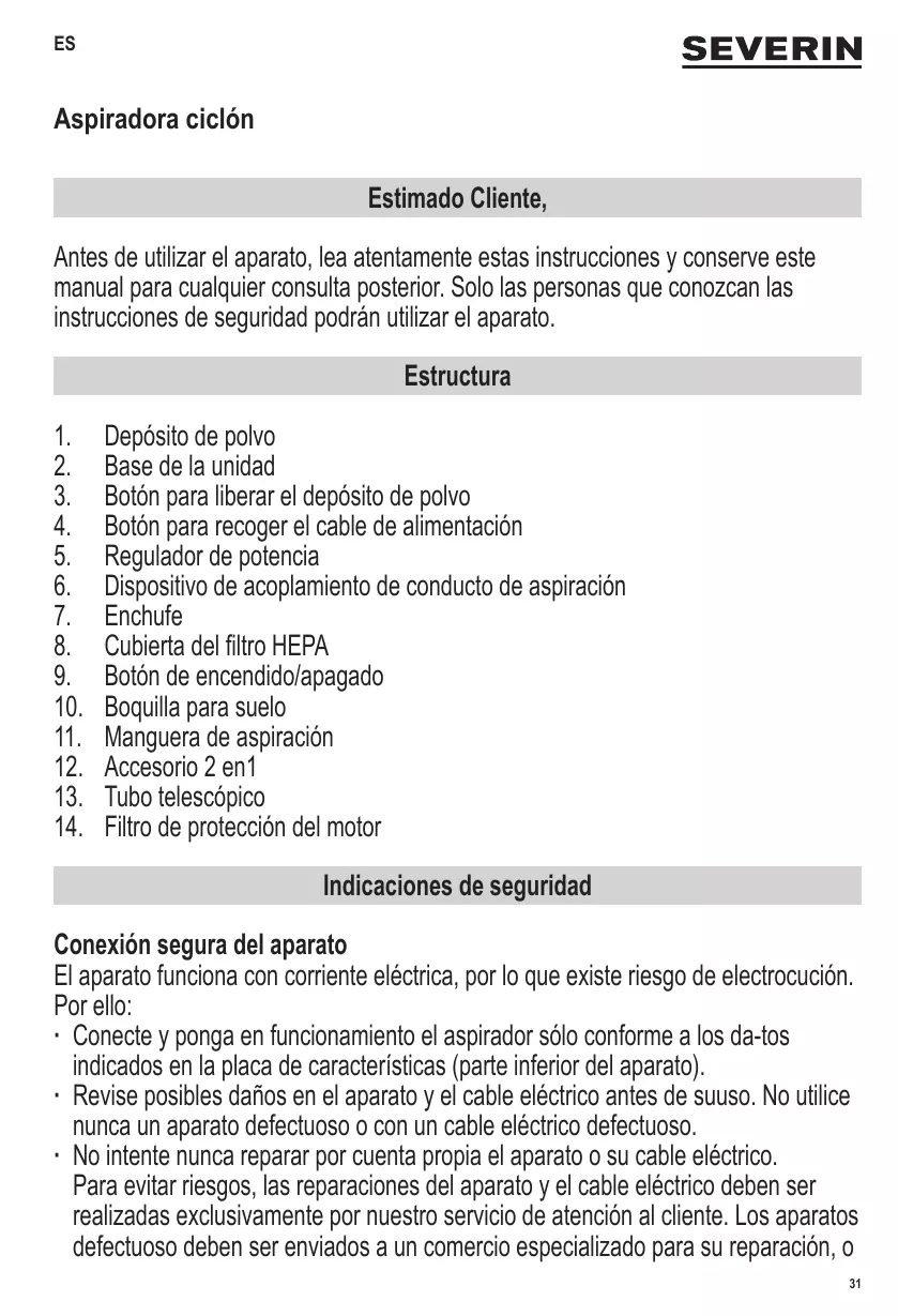 El aparato debe utilizesc unicamente en el ambito domestico. El aparato debe utilizesc exclusivamente para aspirar suelos secs, con una sociedad normal o dependiendo de los accesorios, también muebles y cojines. Cualquier除外 uso se considera no adecuado y está prohibido.