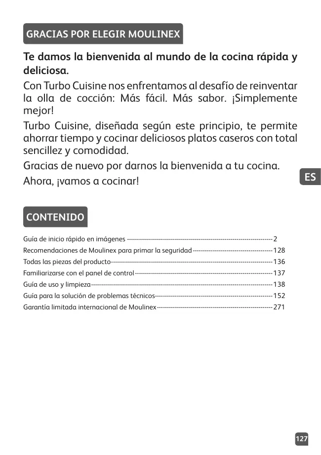 Moulinex fait de la sécurité une priorité-------------------------------------------------------------------9 Détail des éléments composant votre produit----------------------------------------------------------17 Découverte de l’interface utilisateur------------------------------------------------------------------------18 Guide d'utilisation et de nettoyage-------------------------------------------------------------------------19 Guide de dépannage technique------------------------------------------------------------------------------35 Garantie limitée internationale de Moulinex------------------------------------------------------------271