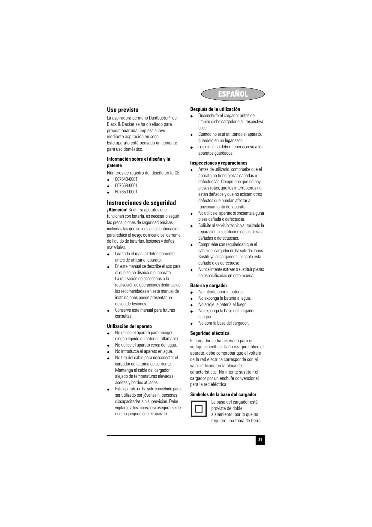 X El aparato se debe cargar durante un mínimo de 16 horas. Durante la carga, es posible que el cargador se caliente. Esto es normal y no indica ningún fallo en el funcionamiento. Se puede dejar el aparato conectado al cargador indefinidamente. El indicador de carga (5) permanecerá encendido siempre que esté conectado al cargador y éste último permanezca enchufado. ¡Atención! No cargue la batería a temperatura ambiente si es inferior a 4 °C o superior a 40 °C. Ajuste del colector de polvo (fig. D) X Es posible prolongar el colector de polvo (2) tirando de la extensión (1) hasta que quede bloqueada en la posición correspondiente. X Retraiga la prolongación del colector de polvo (1) al pulsar la zona (12) marcada con una flecha y empujar la prolongación del colector de polvo (1) hacia el interior de éste (2). Encendido y apagado (fig. E y F) X Para encender el aparato, deslice el conmutador de encendido y apagado (4) hacia delante. La reutilización de materiales reciclados contribuye a evitar la contaminación medioambiental y reduce la demanda de materias primas. Las normativas municipales deben ofrecer la recogida selectiva de productos eléctricos del hogar, en puntos municipales previstos para ello o a través del distribuidor en el caso en que se adquiera un nuevo producto. Black & Decker proporciona facilidades para la recogida y reciclado de los productos Black & Decker que hayan llegado al final de su vida útil. Para poder utilizar este servicio, le rogamos entregue el producto a cualquier servicio técnico autorizado que se hará cargo del mismo en nuestro nombre. Para consultar la dirección del servicio técnico más cercano póngase en contacto con la oficina local de Black & Decker en la dirección que se indica en este manual. Como alternativa, se puede consultar en Internet, en la dirección siguiente, la lista de servicios técnicos autorizados e información completa sobre nuestros servicios de postventa y contactos: www.2helpU.com. 34