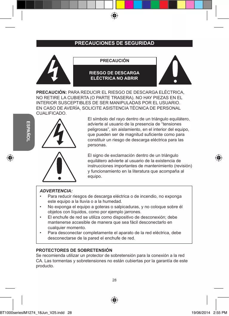 19/06/2014 2:55 PM PRECAUCIONES DE SEGURIDAD PRECAUCIÓN RIESGO DE DESCARGA ELÉCTRICA NO ABRIR ESPAÑOL PRECAUCIÓN: PARA REDUCIR EL RIESGO DE DESCARGA ELÉCTRICA, NO RETIRE LA CUBIERTA (O PARTE TRASERA). NO HAY PIEZAS EN EL INTERIOR SUSCEPTIBLES DE SER MANIPULADAS POR EL USUARIO. EN CASO DE AVERÍA, SOLICITE ASISTENCIA TÉCNICA DE PERSONAL CUALIFICADO. El símbolo del rayo dentro de un triángulo equilátero, advierte al usuario de la presencia de “tensiones peligrosas”, sin aislamiento, en el interior del equipo, que pueden ser de magnitud suficiente como para constituir un riesgo de descarga eléctrica para las personas. El signo de Bexclamación de un triángulo Soludentro tion ENZENE nettoyante equilátero advierte al usuario de la existencia de instrucciones importantes de mantenimiento (revisión) y funcionamiento en la literatura que acompaña al equipo. ADVERTENCIA: • Para reducir riesgos de descarga eléctrica o de incendio, no exponga este equipo a la lluvia o a la humedad. • No exponga el equipo a goteras o salpicaduras, y no coloque sobre él objetos con líquidos, como por ejemplo jarrones. • El enchufe de red se utiliza como dispositivo de desconexión; debe mantenerse accesible de manera que sea fácil desconectarlo en cualquier momento. • Para desconectar completamente el aparato de la red eléctrica, debe desconectarse de la pared el enchufe de red.