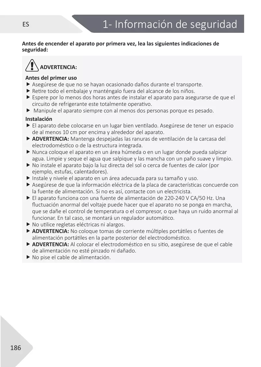 | Mantenimiento y limpieza | Limpieza regular de las superficies interiores y exteriores, descongelación del congelador si es necesario |