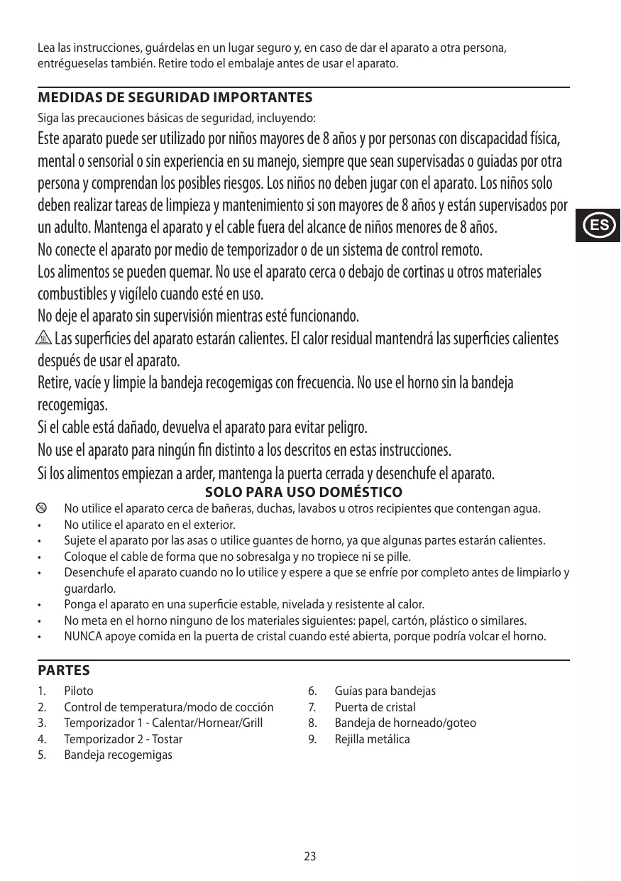 Cet appareil peut être utilisé par des enfants âgés de 8 ans et plus et par des personnes aux aptitudes physiques, sensorielles ou mentales réduites ou ne possédant pas l’expérience et les connaissances suffisantes, pour autant que ces personnes soient supervisées/aient reçu des instructions et soient conscientes des risques encourus. Les enfants ne peuvent pas jouer avec l’appareil. Le nettoyage et l’entretien par l’utilisateur ne doivent pas être effectués par des enfants, à moins qu’ils ne soient âgés de plus de 8 ans et qu’ils soient supervisés. Tenez l’appareil et le câble hors de portée des enfants de moins de 8 ans. Veillez à ne pas connecter l’appareil via une minuterie ou un système de télécommande. Les aliments peuvent brûler. N’utilisez pas l’appareil à côté ou au-dessous de rideaux ou d’autres matériaux combustibles et surveillez-le pendant son utilisation. Ne laissez pas l’appareil sans surveillance en cours d’utilisation. ¬ Les surfaces de l’appareil vont s’échauffer. La chaleur résiduelle permet de maintenir les surfaces chaudes après utilisation. Retirez, videz et nettoyez régulièrement le bac à miettes. N’utilisez pas l’appareil sans le bac à miettes. Si le câble est endommagé, retournez l’appareil afin d’éviter tout risque. N’utilisez pas l’appareil à d’autres fins que celles décrites dans ce mode d’emploi. En cas de flambée des aliments, maintenez la porte fermée et débranchez l’appareil. USAGE MÉNAGER UNIQUEMENT