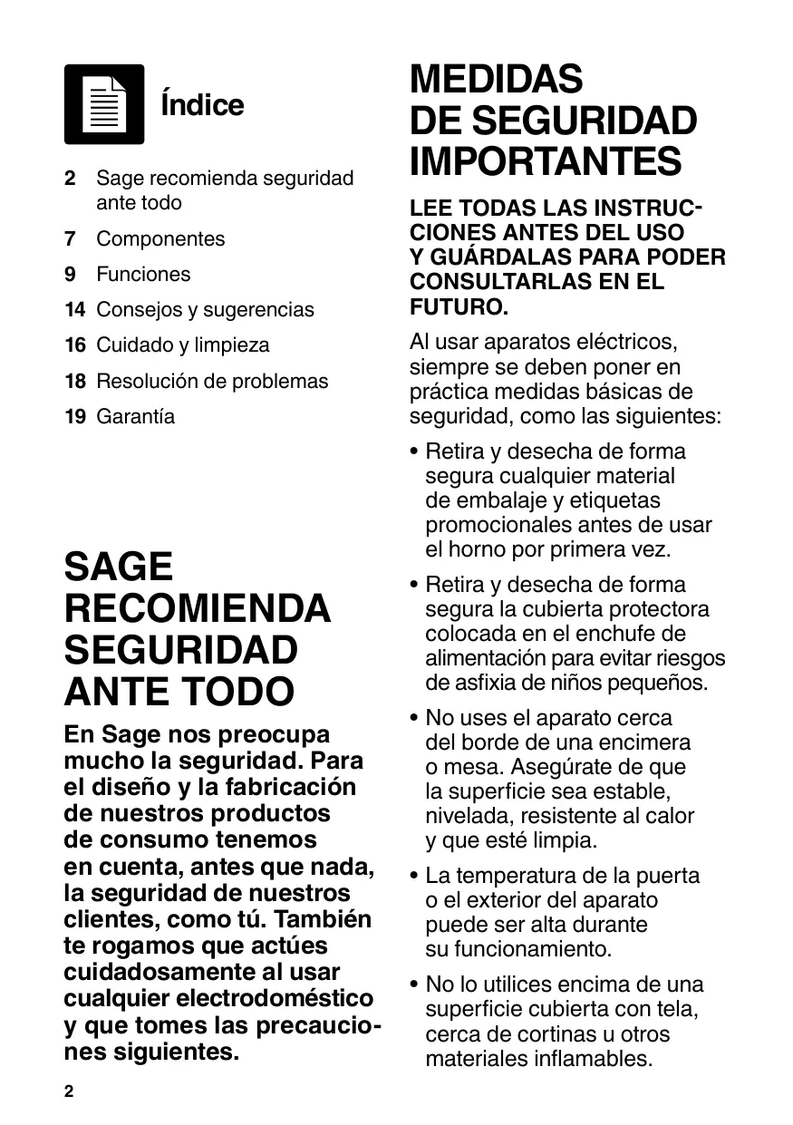 Índice 2 Sage recomienda seguridad ante todo 7 Componentes 9 Funciones 14 Consejos y sugerencias 16 Cuidado y limpieza 18 Resolución de problemas 19 Garantía SAGE RECOMIENDA SEGURIDAD ANTE TODO En Sage nos preocupa mucho la seguridad. Para el diseño y la fabricación de nuestros productos de consumo tenemos en cuenta, antes que nada, la seguridad de nuestros clientes, como tú. También te rogamos que actúes cuidadosamente al usar cualquier electrodoméstico y que tomes las precauciones siguientes.
