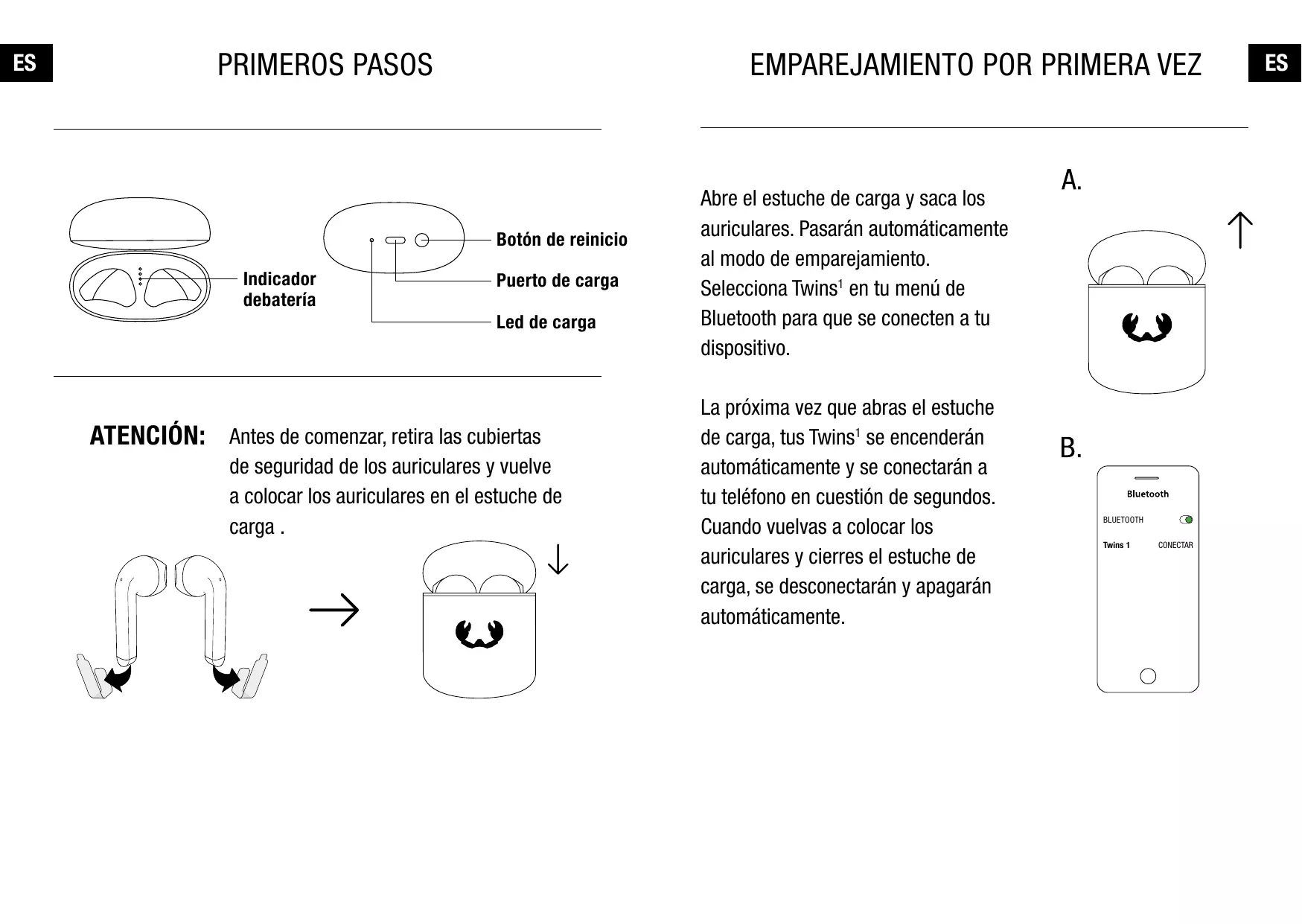 Bluetooth para que se conecten a tu dispositivo. La próxima vez que abras el estuche de carga, tus Twins1 se encenderán automáticamente y se conectarán a tu teléfono en cuestión de segundos. Cuando vuelvas a colocar los auriculares y cierres el estuche de carga, se desconectarán y apagarán automáticamente.