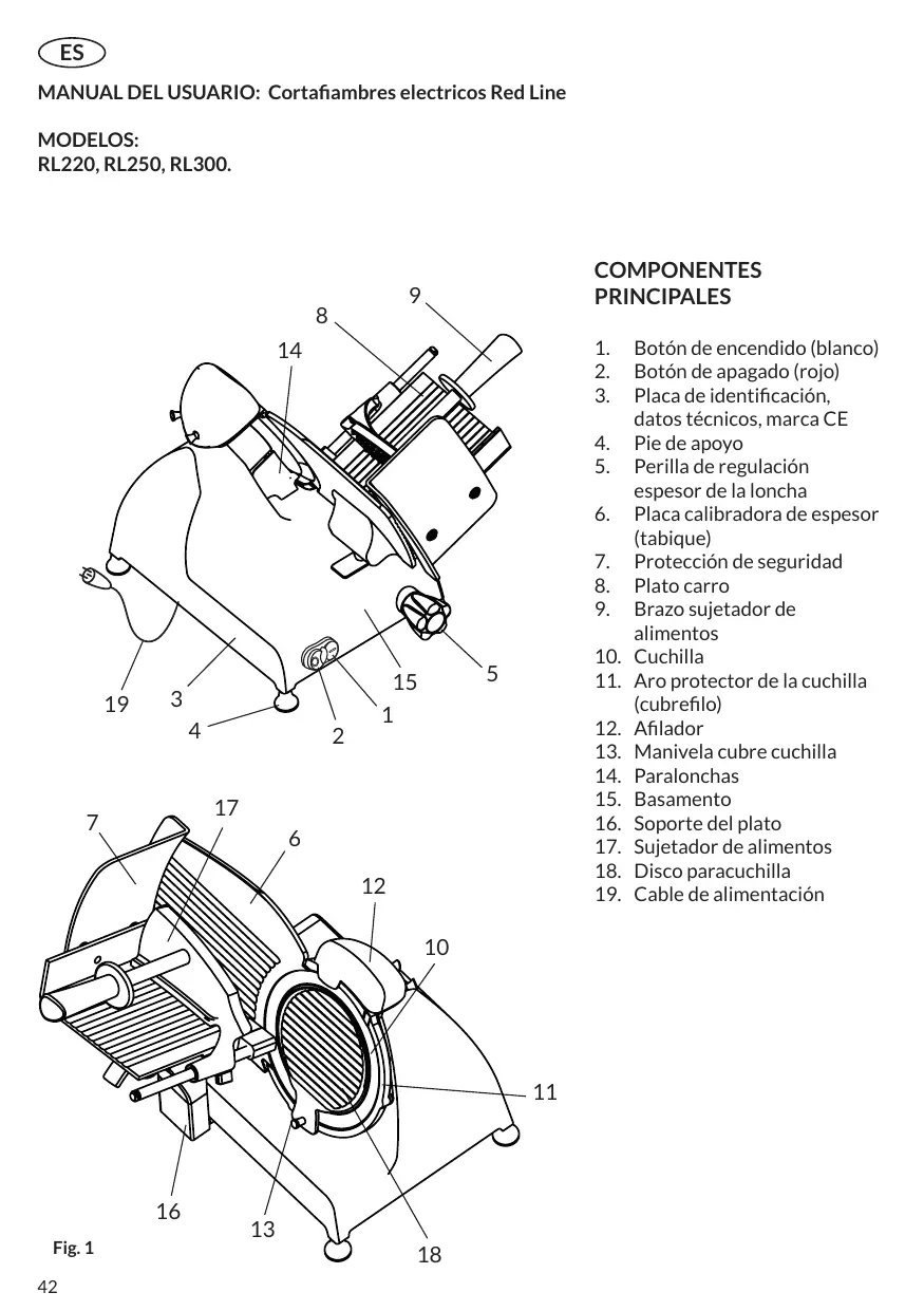 Botón de encendido (blanco) Botón de apagado (rojo) Placa de identificación, datos técnicos, marca CE Pie de apoyo Perilla de regulación espesor de la loncha Placa calibradora de espesor (tabique) Protección de seguridad Plato carro Brazo sujetador de alimentos Cuchilla Aro protector de la cuchilla (cubrefilo) Afilador Manivela cubre cuchilla Paralonchas Basamento Soporte del plato Sujetador de alimentos Disco paracuchilla Cable de alimentación