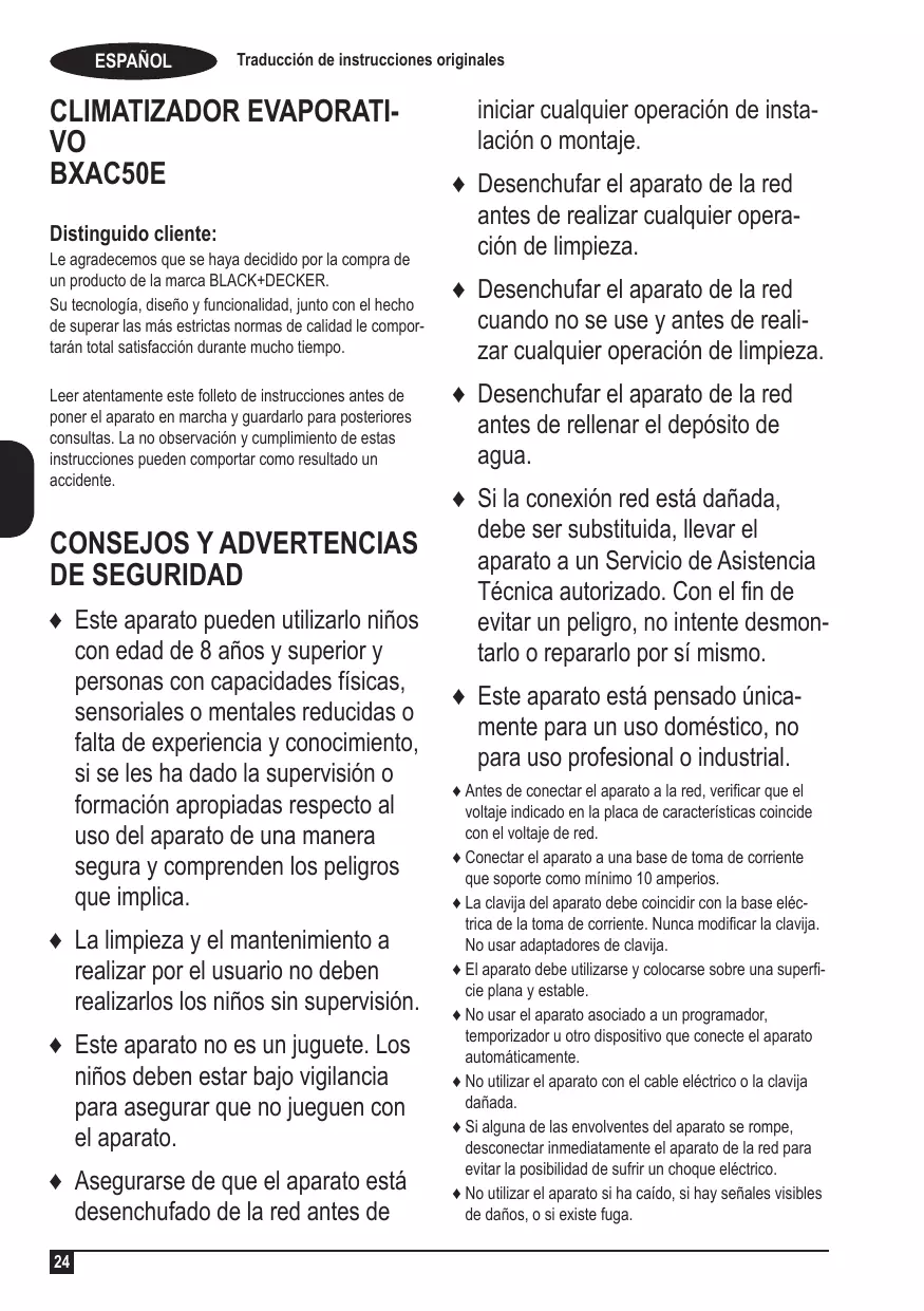 CONSEJOS Y ADVERTENCIAS DE SEGURIDAD ♦ Este aparato pueden utilizarlo niños con edad de 8 años y superior y personas con capacidades físicas, sensoriales o mentales reducidas o falta de experiencia y conocimiento, si se les ha dado la supervisión o formación apropiadas respecto al uso del aparato de una manera segura y comprenden los peligros que implica. ♦ La limpieza y el mantenimiento a realizar por el usuario no deben realizarlos los niños sin supervisión. ♦ Este aparato no es un juguete. Los niños deben estar bajo vigilancia para asegurar que no jueguen con el aparato. ♦ Asegurarse de que el aparato está desenchufado de la red antes de 24