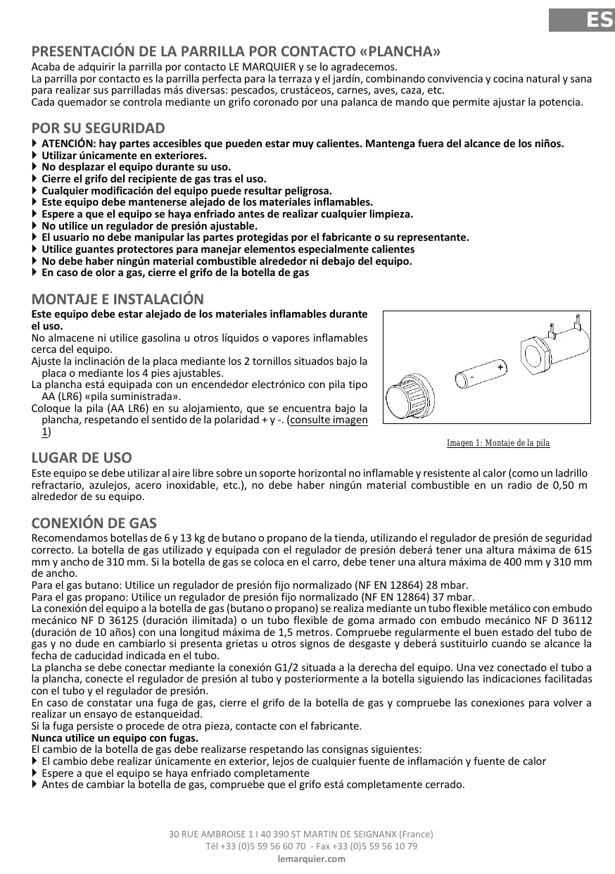 Recomendamos botellas de 6 y 13 kg de butano o propano de la tienda, utilizando el regulador de presión de seguridad correcto. La botella de gas utilizado y equipada con el regulador de presión deberá tener una altura máxima de 615 mm y ancho de 310 mm. Si la botella de gas se coloca en el carro, debe tener una altura máxima de 400 mm y 310 mm de ancho. Para el gas butano: Utilice un regulador de presión fijo normalizado (NF EN 12864) 28 mbar. Para el gas propano: Utilice un regulador de presión fijo normalizado (NF EN 12864) 37 mbar. La conexión del equipo a la botella de gas (butano o propano) se realiza mediante un tubo flexible metálico con embudo mecánico NF D 36125 (duración ilimitada) o un tubo flexible de goma armado con embudo mecánico NF D 36112 (duración de 10 años) con una longitud máxima de 1,5 metros. Compruebe regularmente el buen estado del tubo de gas y no dude en cambiarlo si presenta grietas u otros signos de desgaste y deberá sustituirlo cuando se alcance la fecha de caducidad indicada en el tubo. La plancha se debe conectar mediante la conexión G1/2 situada a la derecha del equipo. Una vez conectado el tubo a la plancha, conecte el regulador de presión al tubo y posteriormente a la botella siguiendo las indicaciones facilitadas con el tubo y el regulador de presión. En caso de constatar una fuga de gas, cierre el grifo de la botella de gas y compruebe las conexiones para volver a realizar un ensayo de estanqueidad. Si la fuga persiste o procede de otra pieza, contacte con el fabricante. Nunca utilice un equipo con fugas. El cambio de la botella de gas debe realizarse respetando las consignas siguientes: El cambio debe realizar únicamente en exterior, lejos de cualquier fuente de inflamación y fuente de calor Espere a que el equipo se haya enfriado completamente Antes de cambiar la botella de gas, compruebe que el grifo está completamente cerrado. 30 RUE AMBROISE 1 I 40 390 ST MARTIN DE SEIGNANX (France) Tél +33 (0)5 59 56 60 70 - Fax +33 (0)5 59 56 10 79 lemarquier.com