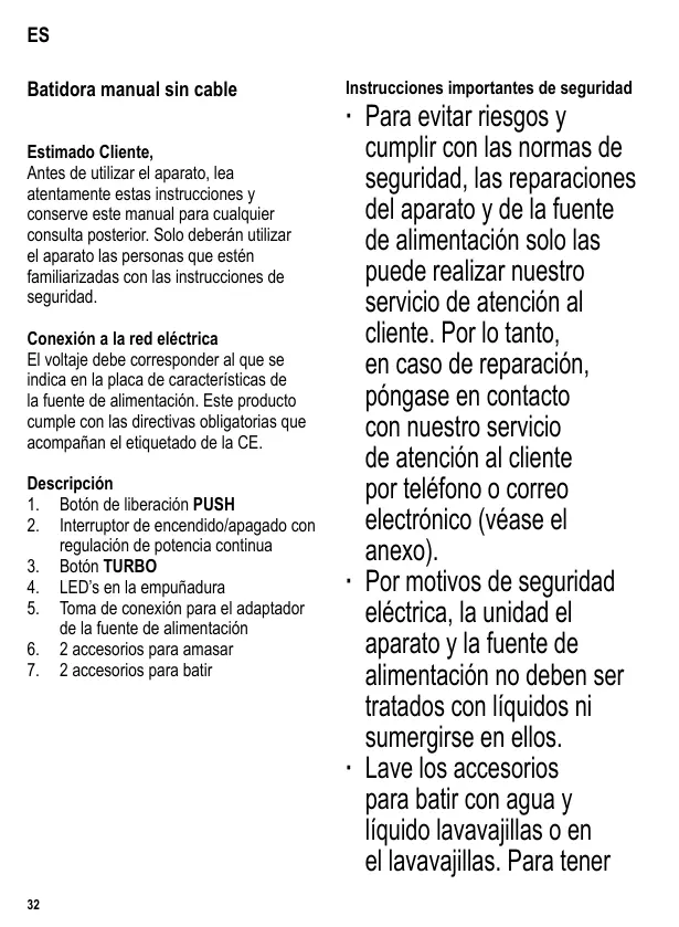 Geachte klant, lees de gebruiksaanwijzing zorgvuldig door voordat u het apparaat gebruikt en bewaar deze voor toekomstig gebruik. Het apparaat mag alleen worden gebruikt door personen, die bekend zijn met de veiligheidsaanwijzingen. 5. Toma de conexión para el adaptador de la fuente de alimentación 6. 2 accesorios para amasar 7. 2 accesorios para batir