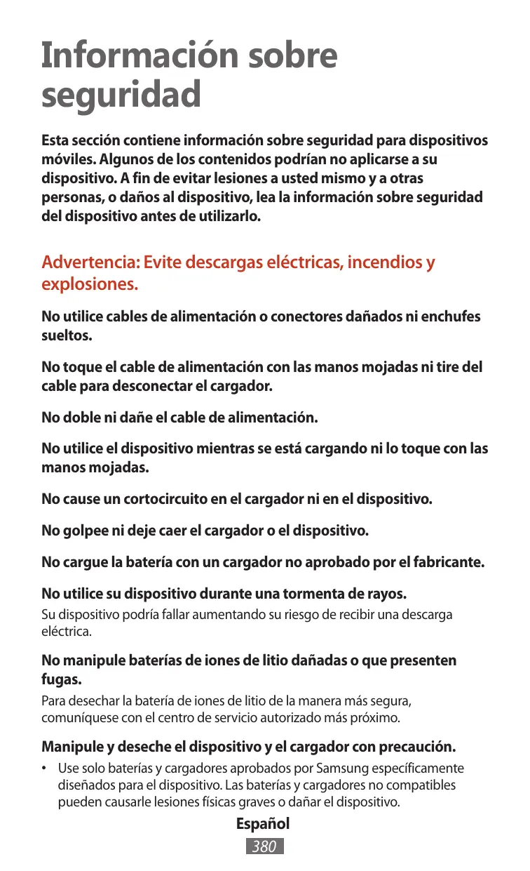 • Use solo baterías y cargadores aprobados por Samsung específicamente diseñados para el dispositivo. Las baterías y cargadores no compatibles pueden causarle lesiones físicas graves o dañar el dispositivo.