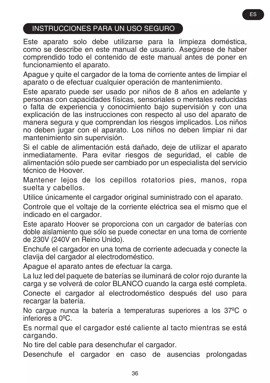 Le nettoyage et l’entretien ne devraient pas être effectués par des enfants sans supervision. Si le cordon d’alimentation est endommagé, arrêtez immédiatement d’utiliser l’appareil. Pour éviter les risques d’accident, un réparateur Hoover agréé doit remplacer le cordon d’alimentation. Maintenez les mains, pieds, vêtements et cheveux à distance des brosses rotatives. Utilisez uniquement le chargeur d’origine qui vous a été fourni avec l’appareil. Vérifiez que la tension de l’alimentation est la même que celle indiquée sur le chargeur. Cet appreil Hoover est fourni avec un chargeur de batterie doublement isolé qui n’est adapté qu’à une prise de 230 V (240 V Grande-Bretagne). Branchez le chargeur dans une prise adaptée et connectez la prise jack du chargeur dans l’appareil. Éteignez l’appareil avant de le charger. Le voyant LED du bloc batterie s’illumine en ROUGE lors de la charge et deviendra BLANC lorsque l’appareil est entièrement chargé. Rebranchez l’appareil au chargeur après l’utilisation pour recharger les batteries. Ne rechargez jamais les batteries dans des températures de plus de 37°C ou en-dessous de 0°C. Il est normal pour le chargeur de devenir chaud au toucher lorsqu’il est en train de charger. Ne pas débrancher en tirant sur le cordon d’alimentation. Débranchez le chargeur en cas d’absence prolongée (vacances, etc.). Rechargez l’appareil de nouveau avant de l’utiliser car les 8