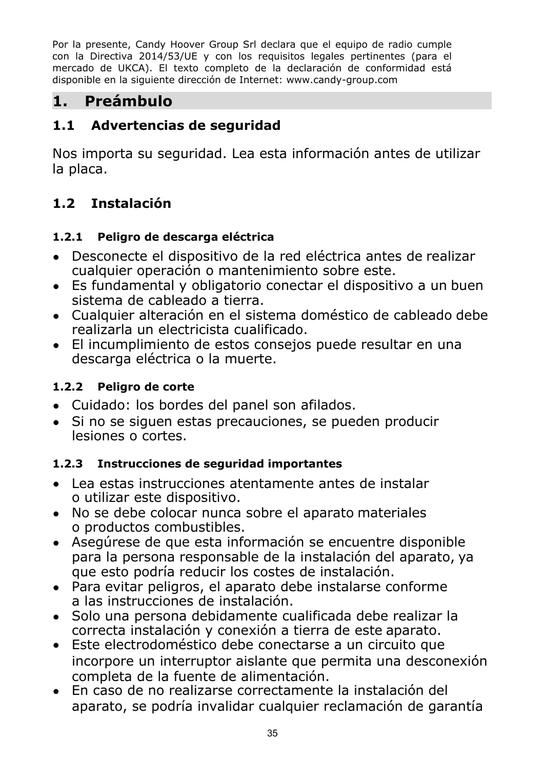 • El incumplimiento de estos consejos puede resultar en una descarga eléctrica o la muerte. 1.3.2 • No deje a los niños solos o sin vigilancia en la zona en la que se encuentre el aparato en uso. Los niños o personas con diversidad funcional que tengan • limitada su capacidad para utilizar el aparato deberían tener una persona responsable y competente que les instruya sobre su empleo. El instructor debería estar satisfecho de que puedan utilizar el aparato sin peligro para sí mismos o su entorno. • No repare ni reemplace ninguna pieza del aparato a menos que se haya recomendado específicamente en el manual. El resto de operaciones de servicio las deberá realizar un técnico cualificado. • No coloque ni deje caer objetos pesados sobre la placa. • No se ponga de pie sobre la placa. • No utilice cacerolas con bordes dentados ni arrastre ollas por la superficie de cristal de inducción, ya que estas acciones podrían rayar el cristal. • No utilice estropajos u otros agentes limpiadores muy agresivos para limpiar la placa, ya que esto puede rayar el cristal de inducción. • Este aparato está diseñado para su uso doméstico y para aplicaciones similares, tales como: áreas de cocina para personal en tiendas, oficinas y otros entornos de trabajo, granjas, clientes en hoteles, moteles y otros entornos residenciales similares, y entornos del tipo bed and breakfast. • ADVERTENCIA: El electrodoméstico y sus accesorios se