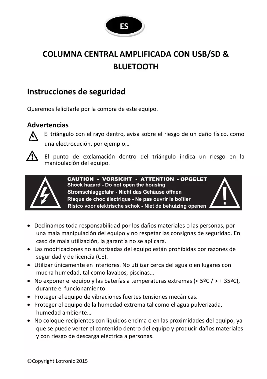 ES COLUMNA CENTRAL AMPLIFICADA CON USB/SD & BLUETOOTH Instrucciones de seguridad Queremos felicitarle por la compra de este equipo.