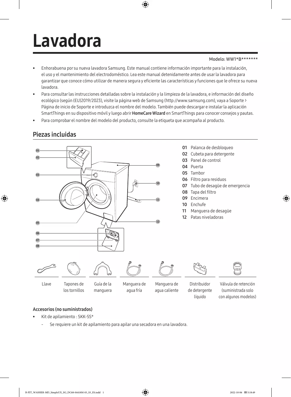 Para consultar las instrucciones detalladas sobre la instalación y la limpieza de la lavadora, e información del diseño ecológico (según (EU)2019/2023), visite la página web de Samsung (http://www.samsung.com), vaya a Soporte > Página de inicio de Soporte e introduzca el nombre del modelo. También puede descargar e instalar la aplicación SmartThings en su dispositivo móvil y luego abrir HomeCare Wizard en SmartThings para conocer consejos y pautas.