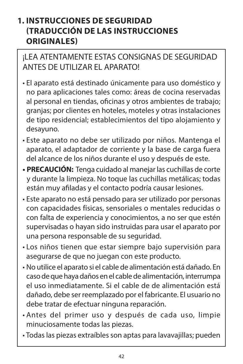 1. INSTRUCCIONES DE SEGURIDAD (TRADUCCIÓN DE LAS INSTRUCCIONES ORIGINALES) ¡LEA ATENTAMENTE ESTAS CONSIGNAS DE SEGURIDAD ANTES DE UTILIZAR EL APARATO! • El aparato está destinado únicamente para uso doméstico y no para aplicaciones tales como: áreas de cocina reservadas al personal en tiendas, oficinas y otros ambientes de trabajo; granjas; por clientes en hoteles, moteles y otras instalaciones de tipo residencial; establecimientos del tipo alojamiento y desayuno. • Este aparato no debe ser utilizado por niños. Mantenga el aparato, el adaptador de corriente y la base de carga fuera del alcance de los niños durante el uso y después de este. • PRECAUCIÓN: Tenga cuidado al manejar las cuchillas de corte y durante la limpieza. No toque las cuchillas metálicas; todas están muy afiladas y el contacto podría causar lesiones. • Este aparato no está pensado para ser utilizado por personas con capacidades físicas, sensoriales o mentales reducidas o con falta de experiencia y conocimientos, a no ser que estén supervisadas o hayan sido instruidas para usar el aparato por una persona responsable de su seguridad. • Los niños tienen que estar siempre bajo supervisión para asegurarse de que no juegan con este producto. • No utilice el aparato si el cable de alimentación está dañado. En caso de que haya daños en el cable de alimentación, interrumpa el uso inmediatamente. Si el cable de de alimentación está dañado, debe ser reemplazado por el fabricante. El usuario no debe tratar de efectuar ninguna reparación. • Antes del primer uso y después de cada uso, limpie minuciosamente todas las piezas. • Todas las piezas extraíbles son aptas para lavavajillas; pueden 42