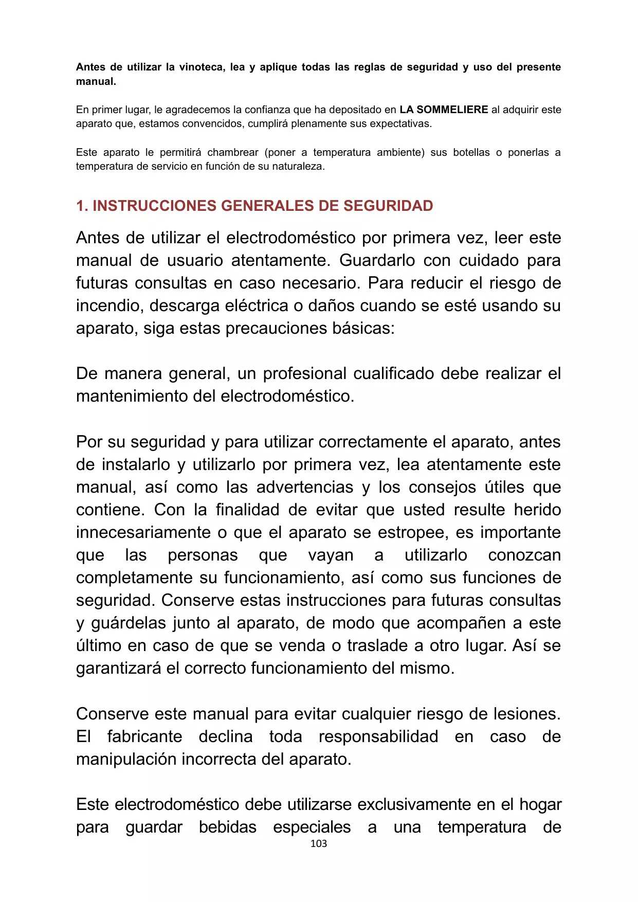 D'une manière générale, votre appareil doit être entretenu par un professionnel qualifié. Pour votre sécurité et pour une utilisation correcte de l’appareil, avant d’installer et d’utiliser l’appareil pour la première fois, lisez attentivement cette notice, y compris les mises en garde et les conseils utiles qu’elle contient. Afin d’éviter d’endommager l’appareil et/ou de vous blesser inutilement, il est important que les personnes amenées à utiliser cet appareil aient pris entièrement connaissance de son fonctionnement ainsi que de ses instructions de sécurité. Conservez ces consignes pour plus tard et pensez à les ranger à côté de l’appareil, afin qu’elles soient transmises avec ce dernier en cas de vente ou de déménagement. Cela permettra de garantir un fonctionnement optimal de l’appareil. Pour éviter tout risque de blessure, conservez cette notice. Le fabricant ne saurait en effet être tenu responsable en cas de mauvaise manipulation de l’appareil. Cet appareil est destiné exclusivement à un usage domestique et est prévu pour le stockage de boissons spéciales à une 1