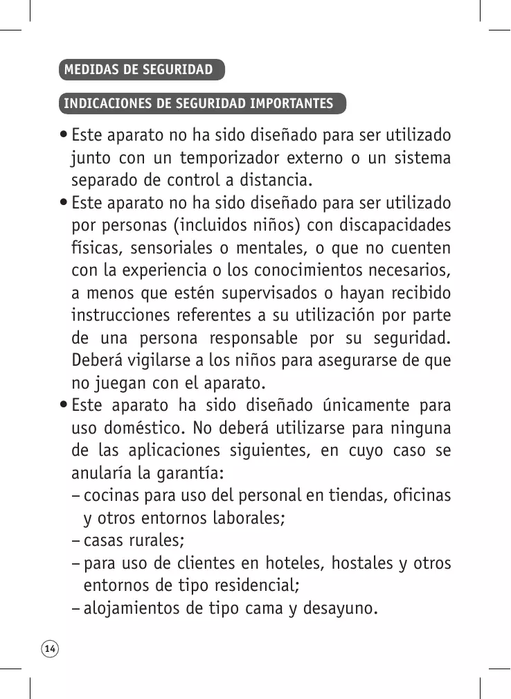 • Cet appareil n'est pas conçu pour être utilisé par des personnes (y compris les enfants) dont les capacités physiques, sensorielles ou mentales sont réduites, ou des personnes dénuées d'expérience ou de connaissance, sauf si elles ont pu bénéficier, par l'intermédiaire d'un adulte responsable de leur sécurité, d'une surveillance ou d'instructions préalables concernant l'utilisation de l'appareil. Les enfants doivent rester sous surveillance afin de garantir qu'ils ne jouent pas avec l'appareil. • Cet appareil est conçu pour une utilisation exclusivement domestique. Il n'est pas conçu pour être utilisé pour les applications suivantes et la garantie ne s'applique pas pour : ––L'espace cuisine du personnel de magasins, bureaux et autres environnements professionnels ; ––fermes ; ––clients des hôtels, motels et autres environnements à caractère résidentiel ; ––environnements de type chambres d'hôtes. 2