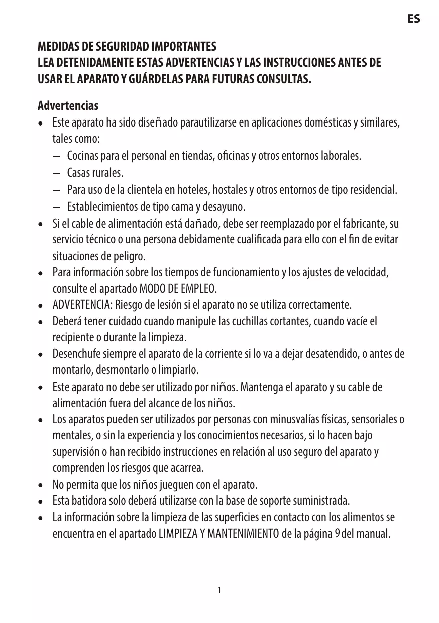 ES MEDIDAS DE SEGURIDAD IMPORTANTES LEA DETENIDAMENTE ESTAS ADVERTENCIAS Y LAS INSTRUCCIONES ANTES DE USAR EL APARATO Y GUÁRDELAS PARA FUTURAS CONSULTAS. Advertencias Este aparato ha sido diseñado parautilizarse en aplicaciones domésticas y similares, tales como: Cocinas para el personal en tiendas, oficinas y otros entornos laborales. Casas rurales. Para uso de la clientela en hoteles, hostales y otros entornos de tipo residencial. Establecimientos de tipo cama y desayuno. Si el cable de alimentación está dañado, debe ser reemplazado por el fabricante, su servicio técnico o una persona debidamente cualificada para ello con el fin de evitar situaciones de peligro. Para información sobre los tiempos de funcionamiento y los ajustes de velocidad, consulte el apartado MODO DE EMPLEO. ADVERTENCIA: Riesgo de lesión si el aparato no se utiliza correctamente. Deberá tener cuidado cuando manipule las cuchillas cortantes, cuando vacíe el recipiente o durante la limpieza. Desenchufe siempre el aparato de la corriente si lo va a dejar desatendido, o antes de montarlo, desmontarlo o limpiarlo. Este aparato no debe ser utilizado por niños. Mantenga el aparato y su cable de alimentación fuera del alcance de los niños. Los aparatos pueden ser utilizados por personas con minusvalías físicas, sensoriales o mentales, o sin la experiencia y los conocimientos necesarios, si lo hacen bajo supervisión o han recibido instrucciones en relación al uso seguro del aparato y comprenden los riesgos que acarrea. No permita que los niños jueguen con el aparato. Esta batidora solo deberá utilizarse con la base de soporte suministrada. La información sobre la limpieza de las superficies en contacto con los alimentos se encuentra en el apartado LIMPIEZA Y MANTENIMIENTO de la página 9 del manual.