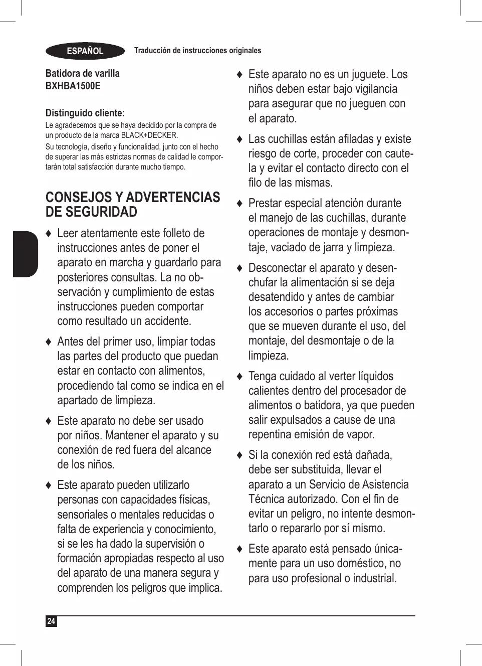 ESPAÑOL Traducción de instrucciones originales Batidora de varilla BXHBA1500E Distinguido cliente: Le agradecemos que se haya decidido por la compra de un producto de la marca BLACK+DECKER. Su tecnología, diseño y funcionalidad, junto con el hecho de superar las más estrictas normas de calidad le comportarán total satisfacción durante mucho tiempo.