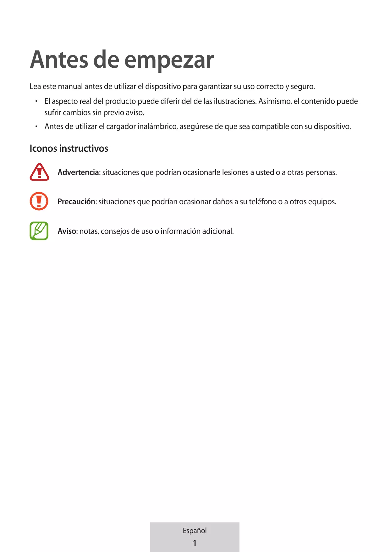 • Cargar más de un dispositivo al mismo tiempo puede disminuir la velocidad de carga. • Si conecta un cargador al dispositivo móvil durante la carga inalámbrica, la función de carga inalámbrica dejará de estar disponible. • Cuando cargue un Galaxy Watch, actualícelo al software más reciente. De no ser así, la velocidad de carga podría ser lenta. • Si utiliza el cargador inalámbrico en áreas con señales de red débiles, puede perder la recepción de la red. • Durante la carga inalámbrica, es posible que el cargador inalámbrico emita ruido. • El cargador no tiene interruptor de encendido y apagado, por tanto, para detener la entrada de corriente eléctrica, debe desenchufarlo de la red. Además, cuando esté conectado, debe permanecer cerca del enchufe. Para ahorrar energía, desenchufe el cargador cuando no lo esté usando.