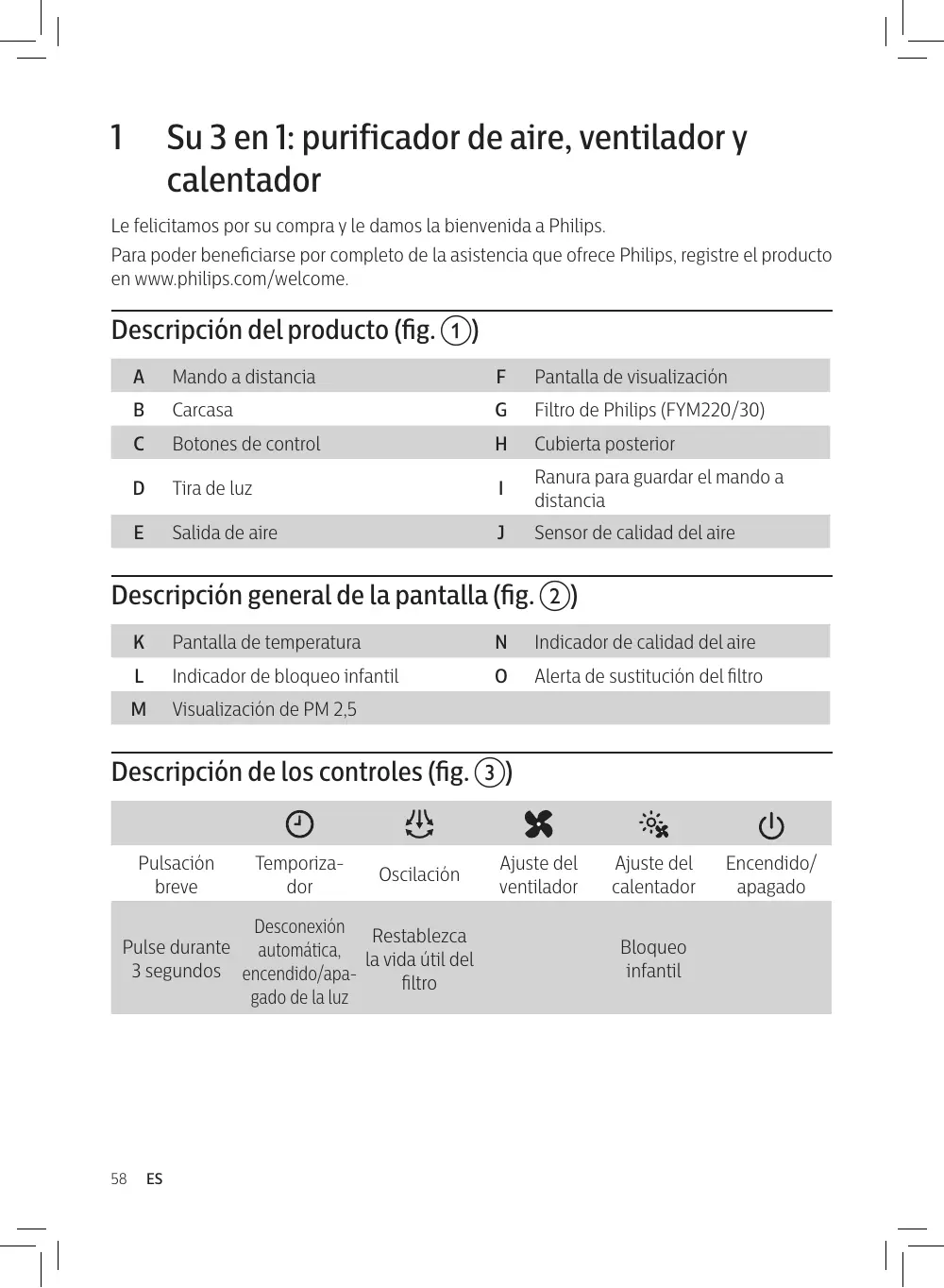 Turning on and off También puede sustituir el filtro antes de que la alerta de sustitución del filtro ( ) se encienda. En caso de que lo haga, deberá restablecer manualmente el contador de vida útil del filtro. 1 Desenchúfelo de la toma de corriente y espere 10 segundos. 2 Introduzca la clavija en la toma de corriente (fig. z). 3 Antes de que transcurran 15 segundos desde el encendido, mantenga pulsado el botón durante 3 segundos para reiniciar el contador de vida útil del filtro. » La alerta de sustitución del filtro parpadea una vez después de restablecer correctamente el filtro.