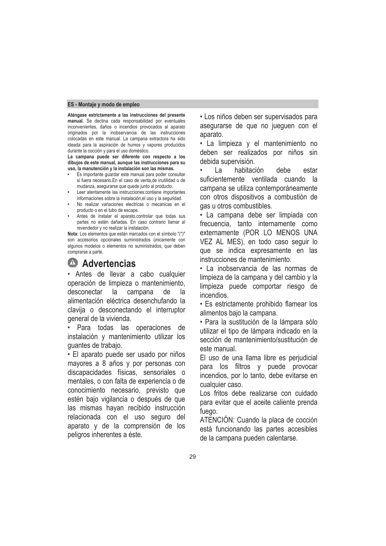 • Para la sustitución de la lámpara sólo utilizar el tipo de lámpara indicado en la sección de mantenimiento/sustitución de este manual. El uso de una llama libre es perjudicial para los filtros y puede provocar incendios, por lo tanto, debe evitarse en cualquier caso. Los fritos debe realizarse con cuidado para evitar que el aceite caliente prenda fuego. ATENCIÓN: Cuando la placa de cocción está funcionando las partes accesibles de la campana pueden calentarse.