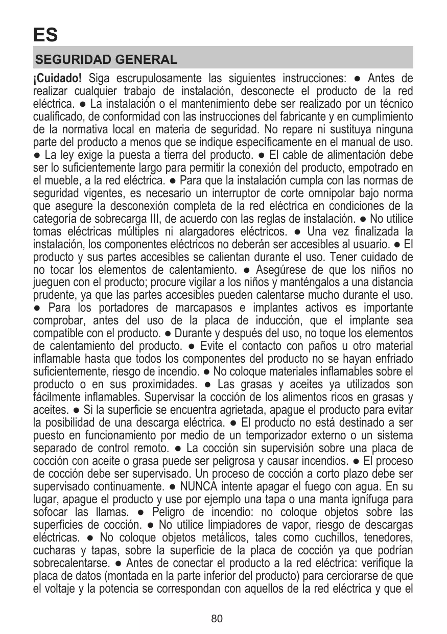 • prima FILTER (13) luz intermitente. ÜLDINE OHUTUSTEAVE Tähelepanu! Järgige täpselt järgmisi juhiseid: ● Enne mis tahes paigaldustööde tegemist tuleb toode vooluvõrgust eraldada. ● Paigaldus- ja hooldustöid peab tegema sobiva väljaõppega töötaja, järgides tootja juhiseid ning kohalikke kehtivaid ohutusnõudeid. Toote osi võib parandada või asendada ainult juhul, kui see on kasutusjuhendis spetsiaalselt lubatud. ● Toote maandus on seaduse järgi kohustuslik. ● Toitekaabel peab olema piisavalt pikk, et ühendada köögimööbliga ühildatud seade elektrivõrku. ● Paigalduse vastamiseks kehtivatele ohutusnõuetele peab masin olema varustatud automaatlülitiga, mis tagab täieliku võrgust isoleerimise III kategooria ülepinge korral, seda vastavuses paigaldusnõuetega. ● Ärge kasutage harupistikut ega pikendusjuhet. ● Pärast paigaldamise lõpetamist ei tohi elektrilised komponendid olla enam kasutajale ligipääsetavad. ● Toode ja selle ligipääsetavad osad muutuvad kasutamise ajal tuliseks. Olge ettevaatlik, et te ei puudutaks tuliseid osi. ● Jälgige, et lapsed tootega ei mängiks; jälgige, et lapsed oleksid seadmest ohutus kauguses ega puutuks osi, mis muutuvad kasutamisel tuliseks. ● Südamestimulaatori ja aktiivsete terviseseadmetega inimesed peavad enne induktsioonpliidi kasutamist kontrollima, kas nende seadet tohib selle toote läheduses kasutada. ● Kasutamise ajal ja pärast seda ärge puudutage toote kuumenevaid osi. ● Vältige lappide või süttimisohtlike materjalide kokkupuudet tootega niikaua, kuni kõik selle osad on maha jahtunud. Põlema süttimise oht. ● Ärge asetage süttimisohtlikke materjale tootele ega selle lähedusse. ● Kuum rasv ja õli süttivad kergesti. Ärge jätke pliiti järelevalveta, kui valmistate sellel rasva- või õlirikkaid toite. ● Kui pliidiplaati tekib mõra, siis lülitage toode välja, et vältida elektrilöögiohtu. ● Toode ei ole ette nähtud kasutamiseks välise taimeri või eraldi kaugjuhtimissüsteemiga. ● Õli- või rasvarikka toidu järelevalveta jätmine selle valmistamise ajal võib olla ohtlik ja põhjustada tulekahju. ● Ärge jätke pliiti toiduvalmistamise ajal järelevalveta. Kiirelt valmivat toitu tuleb jälgida pidevalt. ● Leeke ei tohi mitte mingil juhul kustutada veega. Selle asemel lülitage toode välja ja lämmatage leegid näiteks tuleteki või süttimiskindla kattega. ● Tulekahjuoht: ärge asetage pliidiplaadile esemeid. ● Ärge kasutage aurupuhasteid, elektrilöögioht. ● Ärge asetage pliidiplaadile metallesemeid, nagu nuge, kahvleid, lusikaid või potikaasi, mis võivad sellel kuumeneda. ● Enne toote ühendamist vooluvõrku: kontrollige andmeplaati (asub toote alumises osas) ning veenduge, et pinge ja võimsus vastavad vooluvõrgu omale ning ühenduspesa on sobiv. Kahtluste korral pöörduge väljaõppinud elektriku poole.