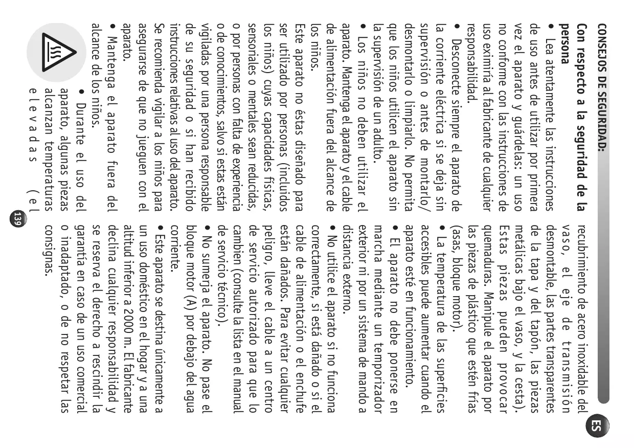 recubrimiento de acero inoxidable del vaso, el eje de transmisión desmontable, las partes transparentes de la tapa y del tapón, las piezas metálicas bajo el vaso, y la cesta). Estas piezas pueden provocar quemaduras. Manipule el aparato por las piezas de plástico que estén frías (asas, bloque motor). • La temperatura de las superficies accesibles puede aumentar cuando el aparato esté en funcionamiento. • El aparato no debe ponerse en marcha mediante un temporizador exterior ni por un sistema de mando a distancia externo. • No utilice el aparato si no funciona correctamente, si está dañado o si el cable de alimentación o el enchufe están dañados. Para evitar cualquier peligro, lleve el cable a un centro de servicio autorizado para que lo cambien (consulte la lista en el manual de servicio técnico). • No sumerja el aparato. No pase el bloque motor (A) por debajo del agua corriente. • Este aparato se destina únicamente a un uso doméstico en el hogar y a una altitud inferior a 2000 m. El fabricante declina cualquier responsabilidad y se reserva el derecho a rescindir la garantía en caso de un uso comercial o inadaptado, o de no respetar las consignas. 139