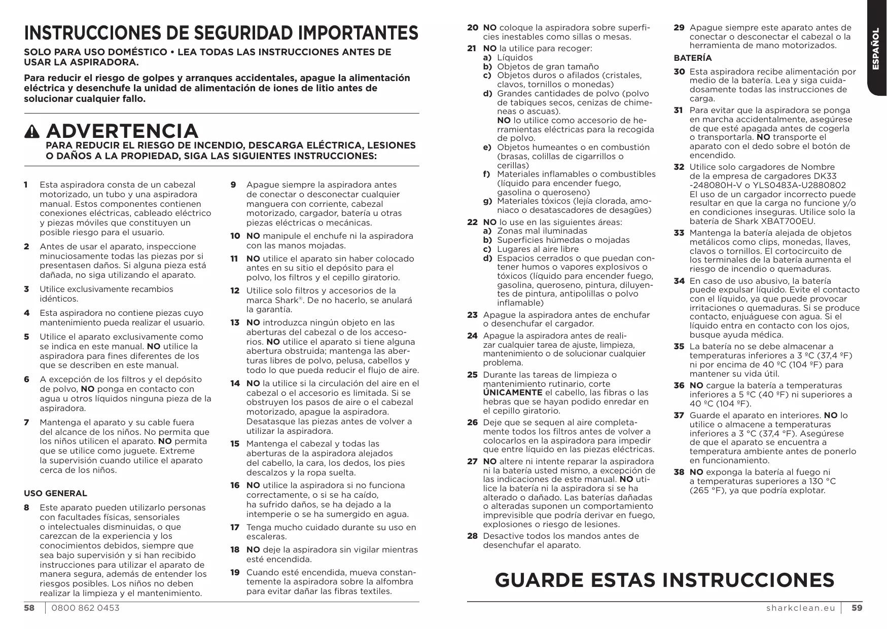 Y GUÁRDELO PARA FUTURAS CONSULTAS. Este manual de instrucciones ha sido diseñado para ayudarle a entender perfectamente el funcionamiento de su nueva aspiradora sin cable Shark DuoClean. Dirija sus preguntas al Servicio de Atención al Cliente llamando al 0800 862 0453.