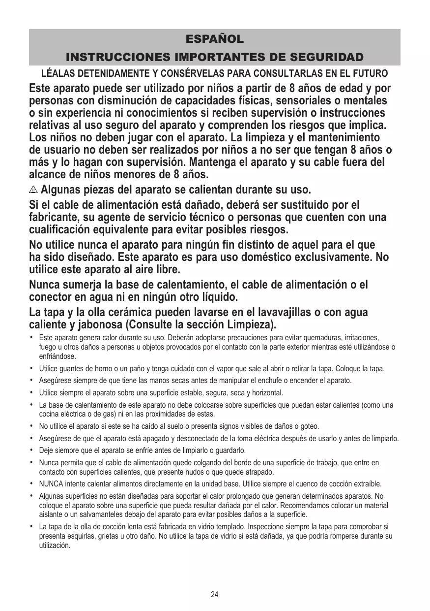 Dans le cas peu probable d’une panne résultant d’un défaut de conception ou de fabrication au cours de la période de garantie, veuillez rapporter l’appareil au magasin où vous l’avez acheté avec votre ticket de caisse et une copie de cette garantie. Vos droits statutaires ne sont aucunement affectés par cette garantie. Seul Jarden Consumer Solutions (Europe) Limited (« JCS (Europe) ») peut modifier ces dispositions. JCS (Europe) s’engage à réparer ou remplacer gratuitement, pendant la période de garantie, toute pièce de l’appareil qui se révèle défectueuse sous réserve que : • vous avertissiez rapidement le magasin ou JCS (Europe) du problème ; • l’appareil n’ait pas été altéré de quelque manière que ce soit ou endommagé, utilisé incorrectement ou abusivement, ou bien réparé ou altéré par une personne autre qu’une personne agréée par JCS (Europe) Products Europe. Cette garantie ne couvre pas les défauts liés à une utilisation incorrecte, un dommage, une utilisation abusive, l’emploi d’une tension incorrecte, les catastrophes naturelles, les événements hors du contrôle de JCS (Europe), une réparation ou une altération par une personne autre qu’une personne agréée par JCS (Europe) ou le non-respect des instructions d’utilisation. De plus, cette garantie ne couvre pas non plus l’usure normale, y compris, mais sans limitation, les petites décolorations et éraflures. Cette garantie s’applique uniquement à l’acheteur d’origine et elle n’étend aucun droit à toute personne acquérant l’appareil pour un usage commercial ou communal. Si votre appareil est accompagné d’une garantie locale ou d’une carte de garantie, veuillez en consulter les dispositions et conditions en vigueur, ou vous adresser à votre revendeur local pour en savoir plus. Les déchets d’équipement électrique ne doivent pas être mélangés aux ordures ménagères. Veuillez recycler si vous en avez la possibilité. Envoyez-nous un email à enquiriesEurope@jardencs.com pour plus d’informations sur le recyclage et la directive WEEE. Jarden Consumer Solutions (Europe) Limited 5400 Lakeside Cheadle Royal Business Park Nunca permita que el cable de alimentación quede colgando del borde de una superficie de trabajo, que entre en contacto con superficies calientes, que presente nudos o que quede atrapado. NUNCA intente calentar alimentos directamente en la unidad base. Utilice siempre el cuenco de cocción extraíble. Algunas superficies no están diseñadas para soportar el calor prolongado que generan determinados aparatos. No coloque el aparato sobre una superficie que pueda resultar dañada por el calor. Recomendamos colocar un material aislante o un salvamanteles debajo del aparato para evitar posibles daños a la superficie. La tapa de la olla de cocción lenta está fabricada en vidrio templado. Inspeccione siempre la tapa para comprobar si presenta esquirlas, grietas u otro daño. No utilice la tapa de vidrio si está dañada, ya que podría romperse durante su utilización.