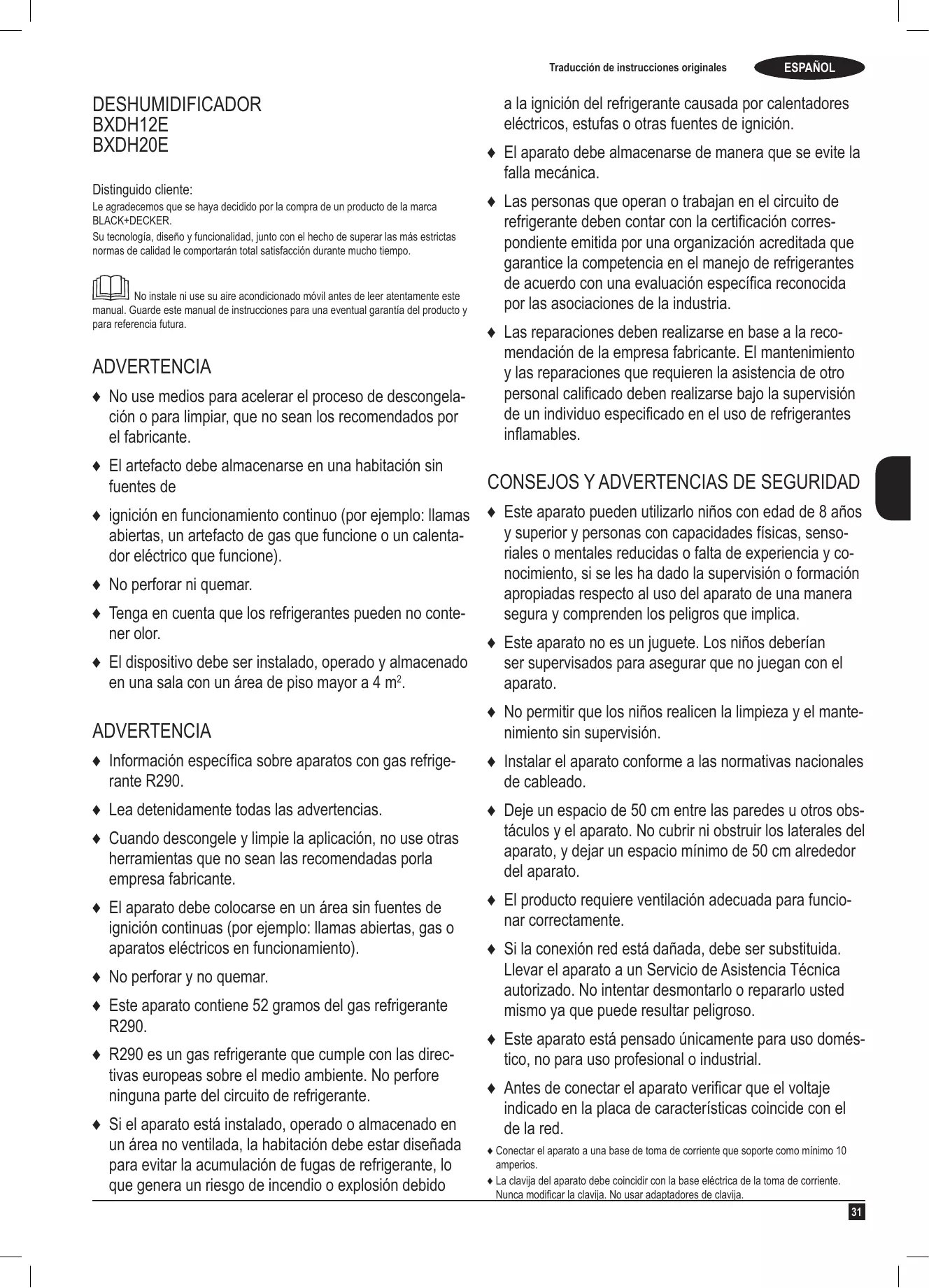 ♦ Después de cada uso, desenchufar el cable de alimentación de la fuente de alimentación. ♦ No usar el aparato si su dispositivo de puesta en marcha/paro no funciona. No retirar las patas del aparato. No mover el aparato mientras está en uso. ♦ Hacer uso de las asas para coger o transportar el aparato. ♦ No dar la vuelta al aparato mientras está en uso o conectado a la red. ♦ Desenchufar la fuente de alimentación de la red cuando no se use y antes de realizar cualquier operación de limpieza. ♦ Guardar este aparato fuera del alcance de los niños y/o personas con capacidades físicas, sensoriales o mentales reducidas o no familiarizados con su uso. ♦ No exponer el aparato a temperaturas extremas. Mantener el aparato en un lugar seco, sin polvo y protegido de la luz directa del sol. No dejar nunca el aparato conectado y sin vigilancia. Además ahorrará energía y prolongará la vida del aparato. ♦ Toda utilización inadecuada, o en desacuerdo con las instrucciones de uso, puede comportar peligro, anulando la garantía y la responsabilidad del fabricante. ♦ Retire y vacíe el depósito de agua antes de mover el aparato. El agua derramada podría provocar daños a las piezas del interior del aparato. ♦ Sírvase de las asas y ruedas del aparato para transportarlo con facilidad y evitar posibles lesiones. ♦ *(Solo para el modelo BXDH20E). Para garantizar el correcto funcionamiento del sistema de purificación de aire, reemplace el filtro HEPA cada 2000 h de uso, aproximadamente. Para comprar nuevos filtros, diríjase al servicio de asistencia técnica.