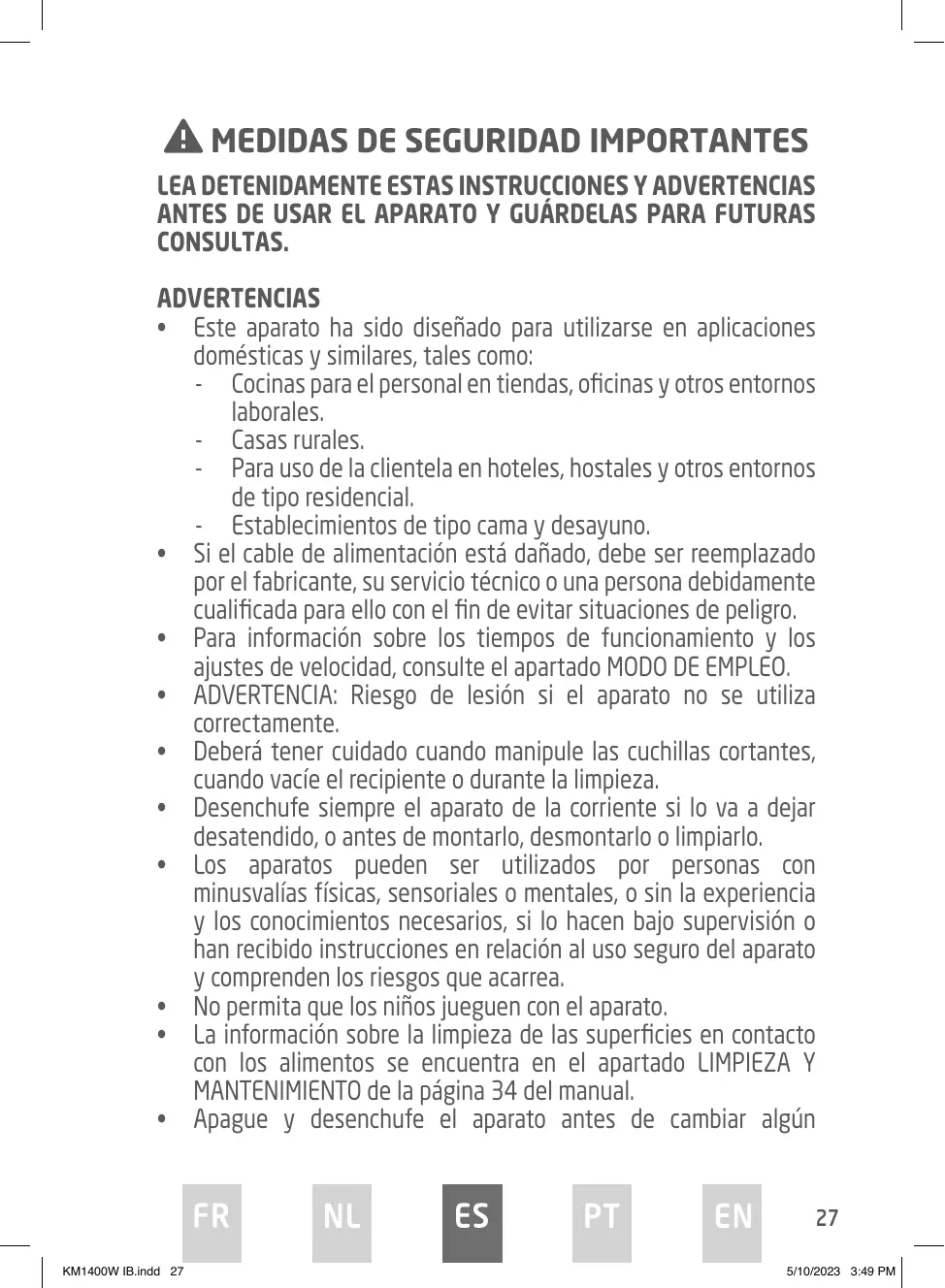 5/10/2023 3:49 PM MEDIDAS DE SEGURIDAD IMPORTANTES LEA DETENIDAMENTE ESTAS INSTRUCCIONES Y ADVERTENCIAS ANTES DE USAR EL APARATO Y GUÁRDELAS PARA FUTURAS CONSULTAS. ADVERTENCIAS • Este aparato ha sido diseñado para utilizarse en aplicaciones domésticas y similares, tales como: - Cocinas para el personal en tiendas, oficinas y otros entornos laborales. - Casas rurales. - Para uso de la clientela en hoteles, hostales y otros entornos de tipo residencial. - Establecimientos de tipo cama y desayuno. • Si el cable de alimentación está dañado, debe ser reemplazado por el fabricante, su servicio técnico o una persona debidamente cualificada para ello con el fin de evitar situaciones de peligro. • Para información sobre los tiempos de funcionamiento y los ajustes de velocidad, consulte el apartado MODO DE EMPLEO. • ADVERTENCIA: Riesgo de lesión si el aparato no se utiliza correctamente. • Deberá tener cuidado cuando manipule las cuchillas cortantes, cuando vacíe el recipiente o durante la limpieza. • Desenchufe siempre el aparato de la corriente si lo va a dejar desatendido, o antes de montarlo, desmontarlo o limpiarlo. • Los aparatos pueden ser utilizados por personas con minusvalías físicas, sensoriales o mentales, o sin la experiencia y los conocimientos necesarios, si lo hacen bajo supervisión o han recibido instrucciones en relación al uso seguro del aparato y comprenden los riesgos que acarrea. • No permita que los niños jueguen con el aparato. • La información sobre la limpieza de las superficies en contacto con los alimentos se encuentra en el apartado LIMPIEZA Y MANTENIMIENTO de la página 34 del manual. • Apague y desenchufe el aparato antes de cambiar algún
